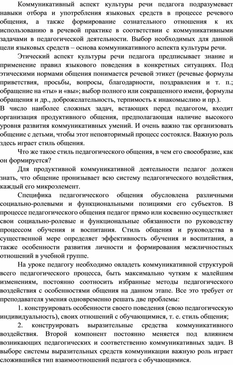 Культура речи – это такой выбор и такая организация языковых средств, которые в определенной ситуации общения при соблюдении современных языковых норм и этики общения позволяют обеспечить наибольший эффект в достижении поставленных задач общения. Культура речи педагога имеет три аспекта: нормативный, этический и коммуникативный.