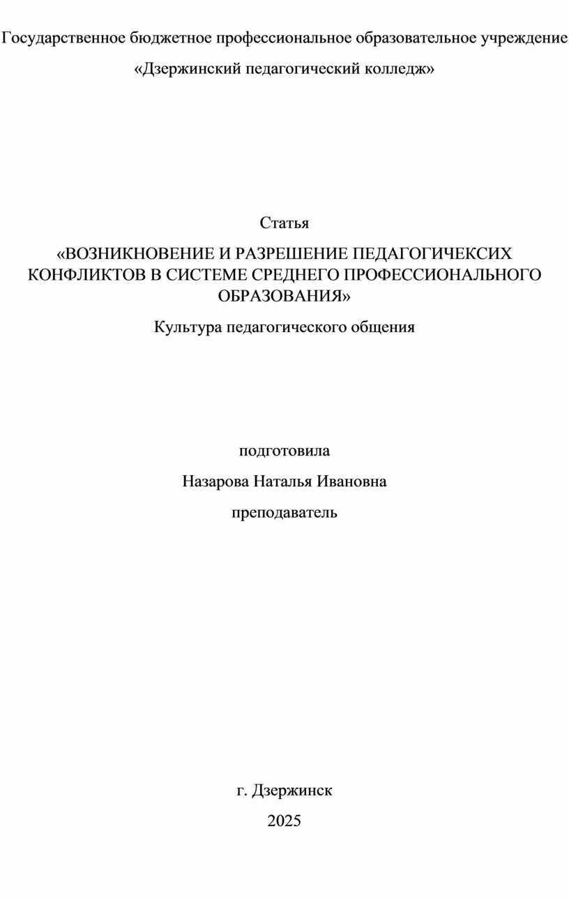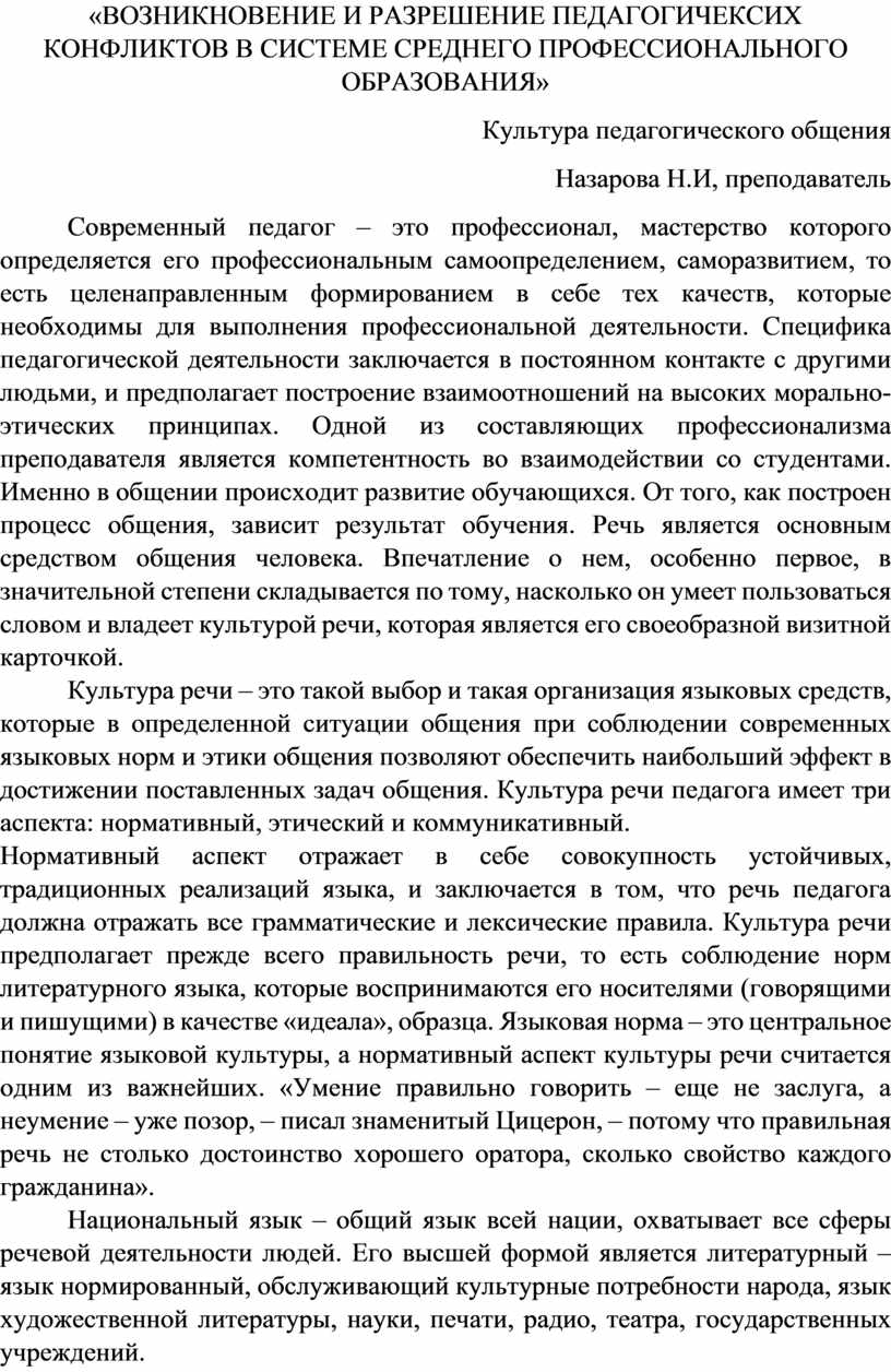 «ВОЗНИКНОВЕНИЕ И РАЗРЕШЕНИЕ ПЕДАГОГИЧЕКСИХ КОНФЛИКТОВ В СИСТЕМЕ СРЕДНЕГО ПРОФЕССИОНАЛЬНОГО ОБРАЗОВАНИЯ»