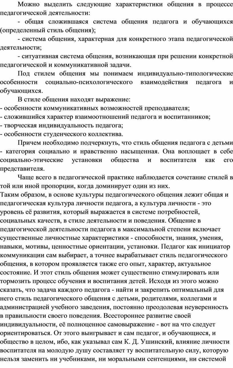 Таким образом, в основе культуры педагогического общения лежит общая и педагогическая культура личности педагога, а культура личности - это уровень её развития, который выражается в системе потребностей, социальных качеств, в стиле деятельности и поведения. Общение в педагогической деятельности педагога в максимальной степени включает существенные личностные характеристики - способности, знания, умения, навыки, мотивы, ценностные ориентации, установки. Педагог как инициатор коммуникации сам выбирает, а точнее вырабатывает стиль педагогического общения, в котором проявляется также его опыт, характер, актуальное состояние. И этот стиль общения может существенно стимулировать или тормозить процесс обучения и воспитания детей. Исходя из этого можно сказать, что задача каждого педагога - найти и закрепить оптимальный для него стиль педагогического общения с детьми, родителями, коллегами и администрацией учебного заведения, постоянно преодолевая неуверенность в правильности своего поведения. Всестороннее развитие своей индивидуальности, её полноценное самовыражение - вот на что следует ориентироваться. От этого выигрывает и сам педагог, и обучающиеся, и общество в целом, ибо, как указывал сам К. Д. Ушинский, влияние личности воспитателя на молодую душу составляет ту воспитательную силу, которую нельзя заменить ни учебниками, ни моральными сентенциями, ни системой наказаний и поощрений. Искусство педагогического общения состоит, следовательно, из двух слагаемых: педагогической культуры личности учителя и техники общения, которая является формой организации поведения педагога. Главным компонентом, конечно, является первый - ведь мы всегда намного охотнее общаемся с интересной личностью, чем с пустым "расспрашивателем". Оптимальное педагогическое общение, согласно А. А. Леонтьеву, - такое общение учителя и учащихся в процессе обучения, которое создаёт наилучшие условия для развития мотивации учащихся и творческого характера учения, для правильного формирования личности учащегося, обеспечивает благоприятный эмоциональный климат обучения и управление социально- психологическими процессами в детском коллективе, позволяет максимально использовать в учебном процессе личностные особенности учителя.