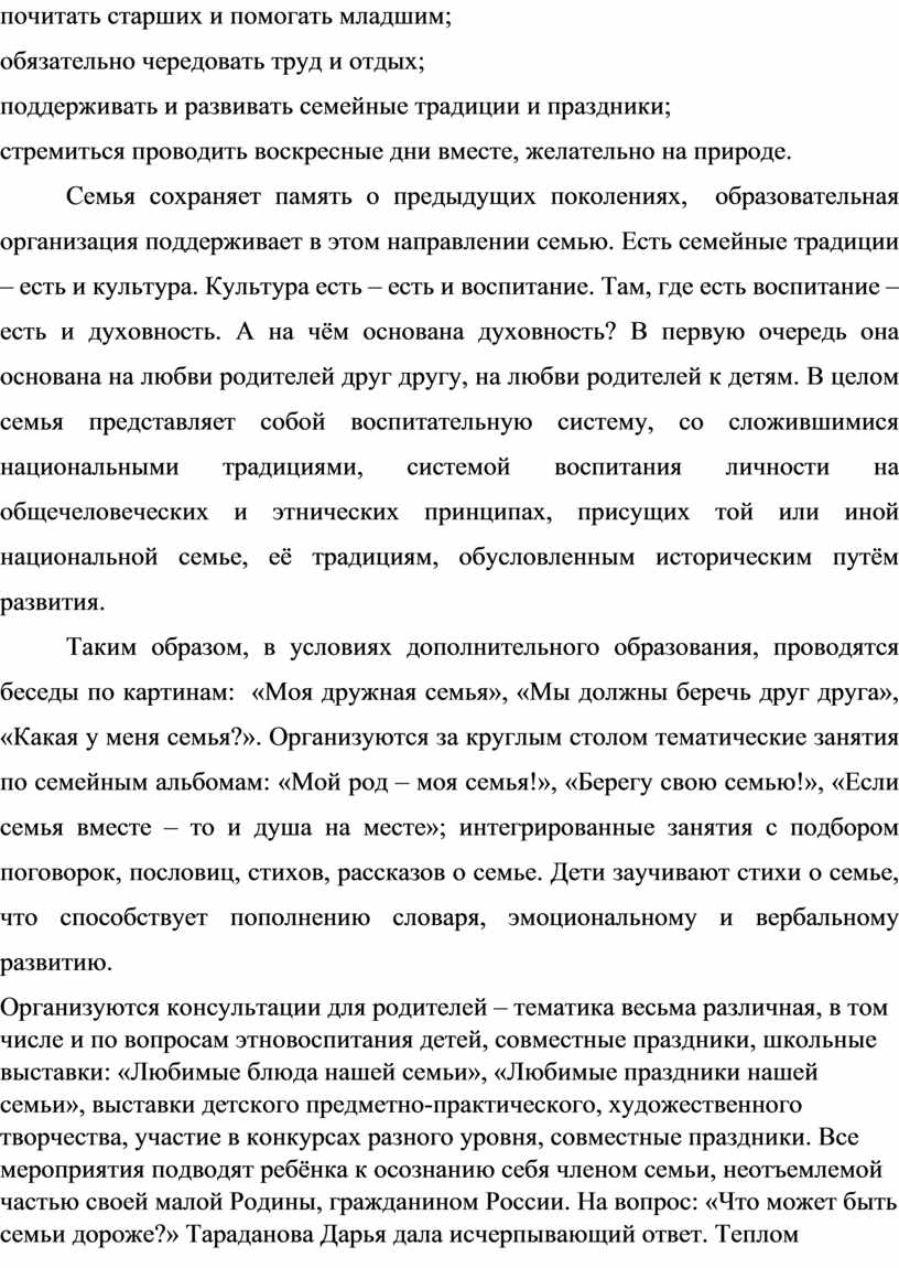 Организуются консультации для родителей – тематика весьма различная, в том числе и по вопросам этновоспитания детей, совместные праздники, школьные выставки: «Любимые блюда нашей семьи», «Любимые праздники нашей семьи», выставки детского предметно-практического, художественного творчества, участие в конкурсах разного уровня, совместные праздники. Все мероприятия подводят ребёнка к осознанию себя членом семьи, неотъемлемой частью своей малой Родины, гражданином России. На вопрос: «Что может быть семьи дороже?» Тараданова Дарья дала исчерпывающий ответ. Теплом встречает отчий дом, здесь ждут тебя всегда с любовью, и провожают в путь с добром! Отец и мать, и дети дружно сидят за праздничным столом, и вместе им совсем не скучно, а интересно впятером. Малыш для старших как любимец, родители – во всём мудрей, любимый папа – друг, кормилец, а мама ближе всех, родней. Любите! И цените счастье! Оно рождается в семье, что может быть её дороже на этой сказочной земле!