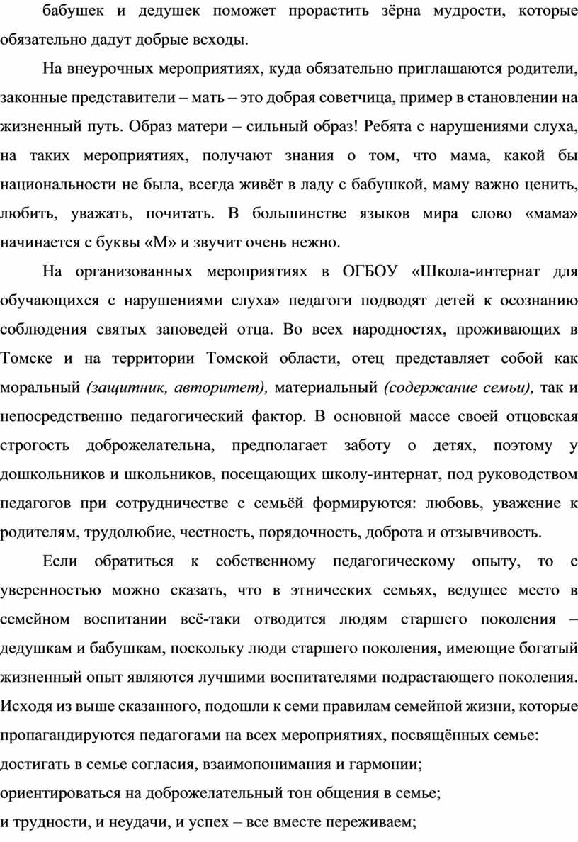 На организованных мероприятиях в ОГБОУ «Школа-интернат для обучающихся с нарушениями слуха» педагоги подводят детей к осознанию соблюдения святых заповедей отца. Во всех народностях, проживающих в Томске и на территории Томской области, отец представляет собой как моральный (защитник, авторитет), материальный (содержание семьи), так и непосредственно педагогический фактор. В основной массе своей отцовская строгость доброжелательна, предполагает заботу о детях, поэтому у дошкольников и школьников, посещающих школу-интернат, под руководством педагогов при сотрудничестве с семьёй формируются: любовь, уважение к родителям, трудолюбие, честность, порядочность, доброта и отзывчивость.
