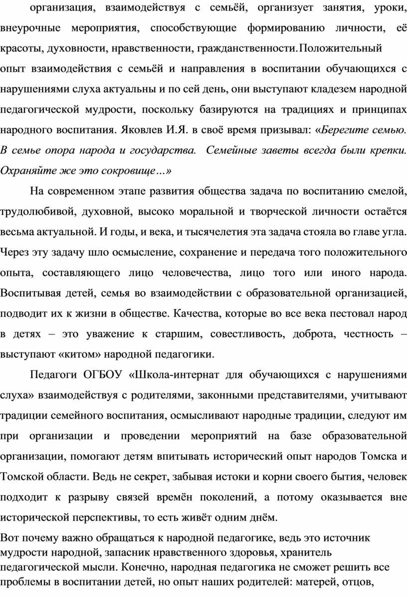 Неоспорима роль семьи в обществе по своей силе в процессе нравственного воспитания, ведь именно в семье будущий член общества овладевает социальными ролями, формируется как личность. Именно семья выступает источником идейно-нравственного воспитания, а образовательная организация, взаимодействуя с семьёй, организует занятия, уроки, внеурочные мероприятия, способствующие формированию личности, её красоты, духовности, нравственности, гражданственности. Положительный опыт взаимодействия с семьёй и направления в воспитании обучающихся с нарушениями слуха актуальны и по сей день, они выступают кладезем народной педагогической мудрости, поскольку базируются на традициях и принципах народного воспитания. Яковлев И.Я. в своё время призывал: «Берегите семью. В семье опора народа и государства. Семейные заветы всегда были крепки. Охраняйте же это сокровище…»