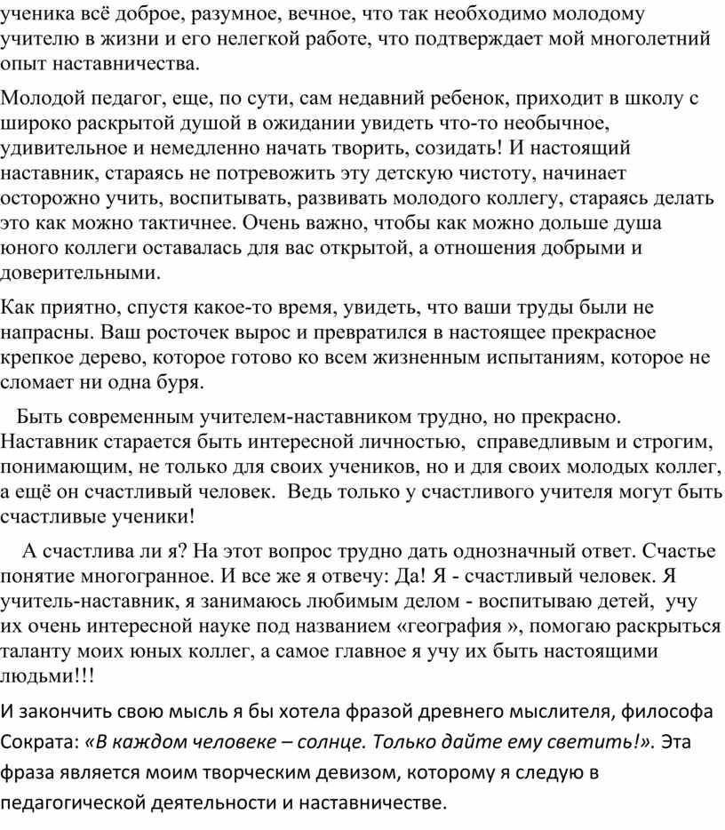 И закончить свою мысль я бы хотела фразой древнего мыслителя, философа Сократа: «В каждом человеке – солнце. Только дайте ему светить!». Эта фраза является моим творческим девизом, которому я следую в педагогической деятельности и наставничестве.