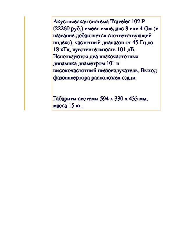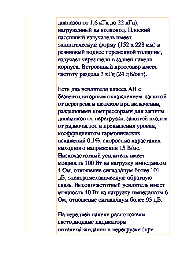 чувствительность 91 дБ, частотныйдиапазон от 1,6 кГц до 22 кГц),