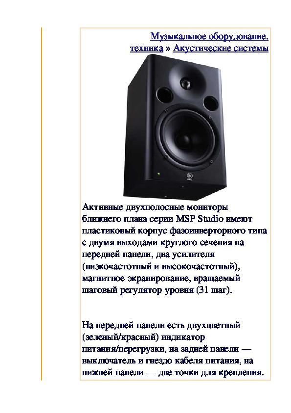 Активные двухполосные мониторы ближнего плана серии MSP Studio имеют пластиковый корпус фазоинверторного типа с двумя выходами круглого сечения на передней панели, два усилителя (низкочастотный и высокочастотный), магнитное экранирование, вращаемый шаговый регулятор уровня (31 шаг).