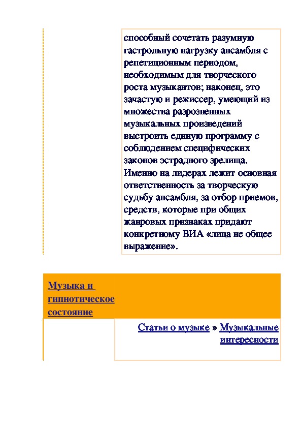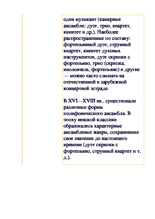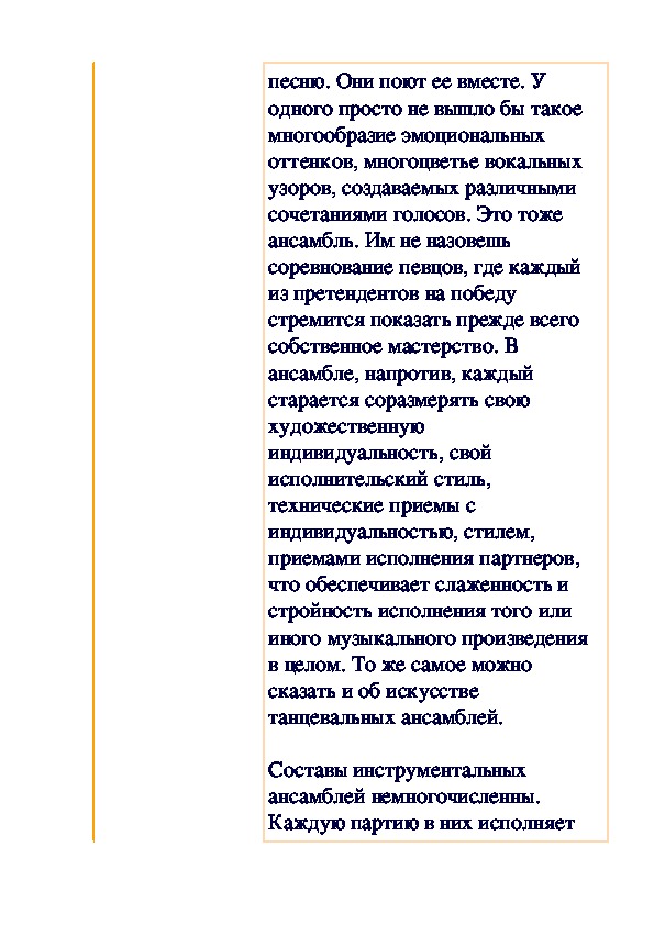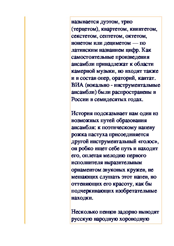 Ансамбль (от фр. ensemble — вместе, множество) — означает совместное исполнение музыкального произведения несколькими участниками или музыкальное произведение для небольшого состава исполнителей; излюбленный с давних времен тип музицирования. В соответствии с количеством исполнителей (от двух до десяти), ансамбль называется дуэтом, трио (терцетом), квартетом, квинтетом, секстетом, септетом, октетом, нонетом или дециметом — по латинским названием цифр. Как самостоятельные произведения ансамбли принадлежат к области камерной музыки, но входят также и в состав опер, ораторий, кантат. ВИА (вокально - инструментальные ансамбли) были распространены в России в семидесятых годах.