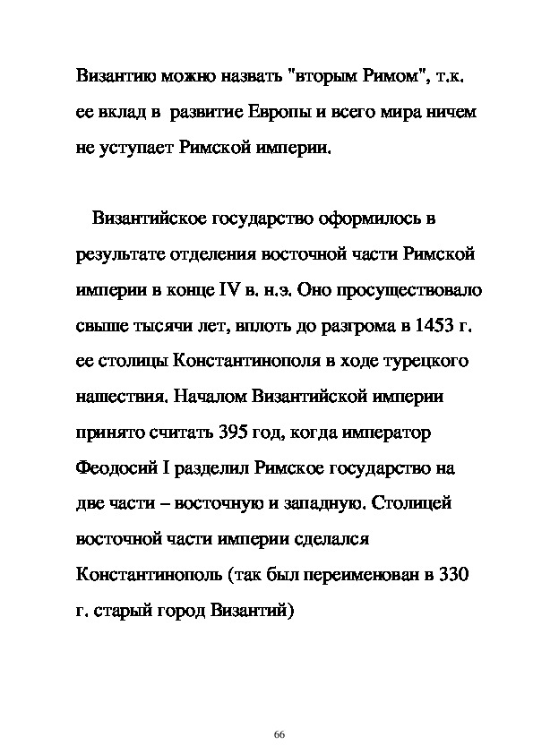 Византийское государство оформилось в результате отделения восточной части Римской империи в конце IV в. н.э. Оно просуществовало свыше тысячи лет, вплоть до разгрома в 1453 г. ее столицы Константинополя в ходе турецкого нашествия. Началом Византийской империи принято считать 395 год, когда император Феодосий I разделил Римское государство на две части – восточную и западную. Столицей восточной части империи сделался Константинополь (так был переименован в 330 г. старый город Византий)