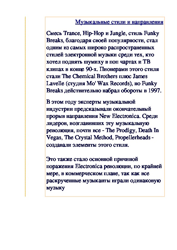 Смесь Trance, Hip-Hop и Jungle, стиль Funky Breaks, благодаря своей популярности, стал одним из самых широко распространенных стилей электронной музыки среди тех, кто хотел поднять шумиху в поп чартах и ТВ клипах в конце 90-х. Пионерами этого стиля стали The Chemical Brothers плюс James Lavelle (студия Mo' Wax Records), но Funky Breaks действительно набрал обороты в 1997.