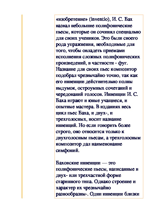 Латинское слово «инвенцио» означает «выдумка», «изобретение». Такое название (или подзаголовок) композиторы XVII—XVIII вв. давали своим пьесам, в которых применяли разнообразные сложные приемы изложения, разработки и развития музыкального материала. Это слово не стало обозначать какой-то определенной музыкальной формы со своими отличительными признаками. Этим словом, означающим по-латыни «изобретение» (inventio), И. С. Бах назвал небольшие полифонические пьесы, которые он сочинял специально для своих учеников. Это были своего рода упражнения, необходимые для того, чтобы овладеть приемами исполнения сложных полифонических произведений, в частности - фуг. Название для своих пьес композитор подобрал чрезвычайно точно, так как его инвенции действительно полны выдумок, остроумных сочетаний и чередований голосов. Инвенции И. С. Баха играют и юные учащиеся, и опытные мастера. В изданиях весь цикл пьес Баха, и двух-, и трехголосных, носит название инвенций. Но если говорить более строго, оно относится только к двухголосным пьесам, а трехголосным композитор дал наименование симфоний.