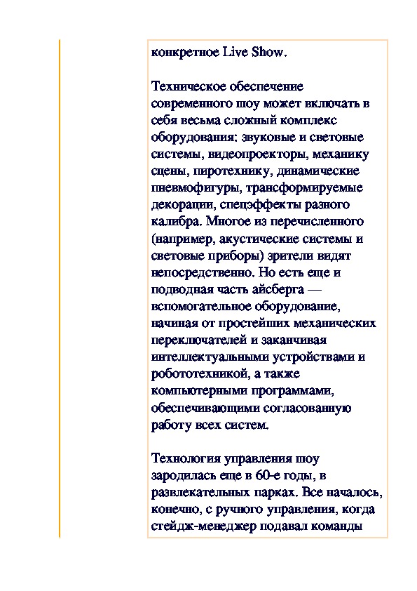 С некоторых пор слово "шоу" прочно закрепилось в нашем языке для обозначения всего того, что раньше называлось представлением. Спектакль, мюзикл, концерт — то есть некое массовое мероприятие, где задействованы артисты, звук, свет, видео, спецэффекты. На западе "шоу" трактуется и в более широком смысле, начиная от мультимедийной лекции или семинара и заканчивая парками развлечений по типу Диснейленда. А если говорят о "живом" выступлении, то есть когда на сцене работают артисты, используется более конкретное Live Show