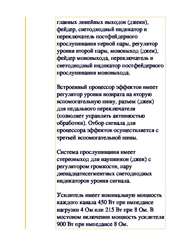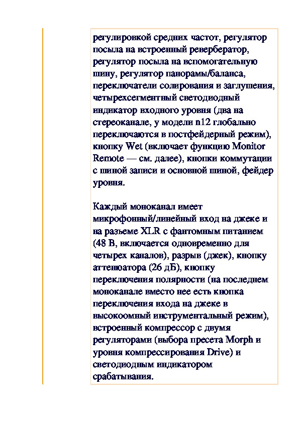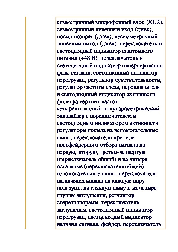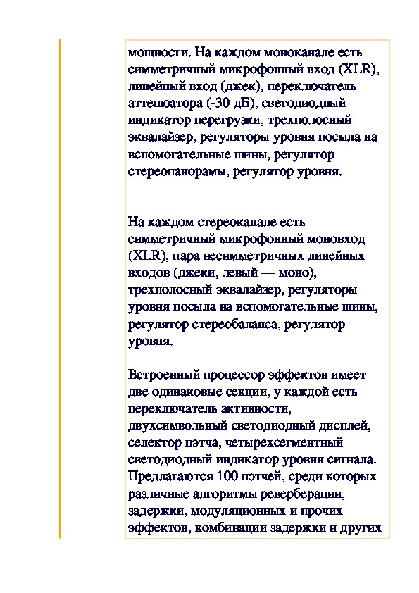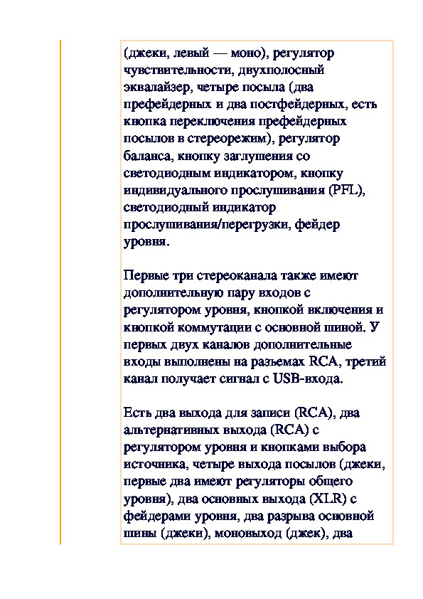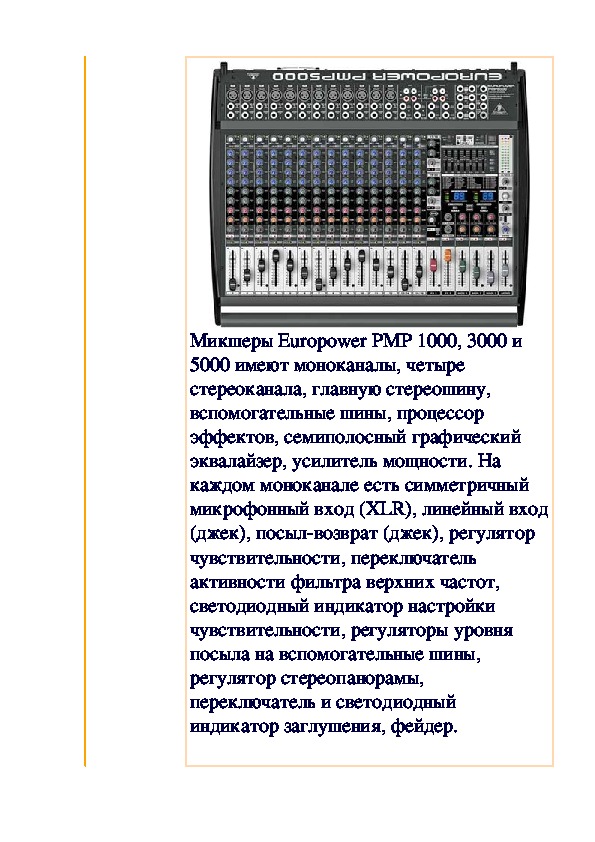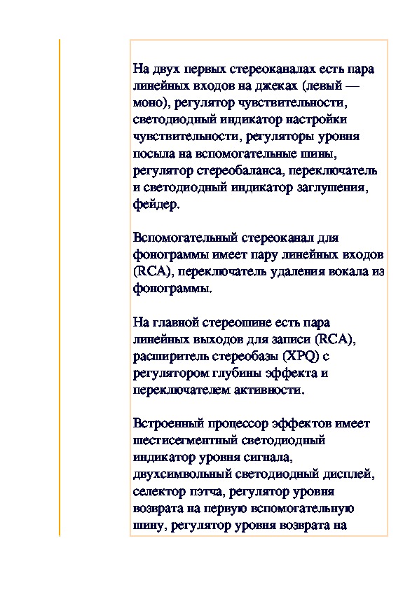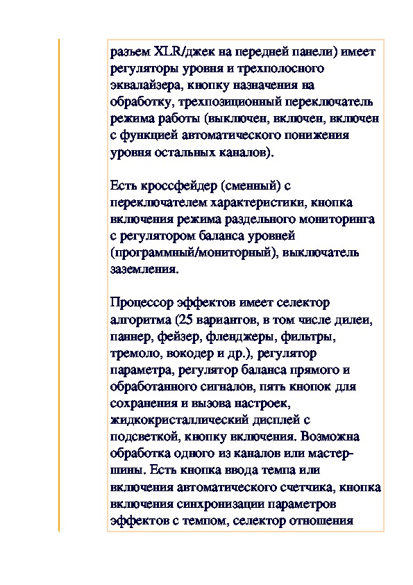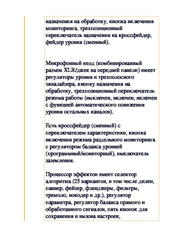 Микрофонный вход (комбинированный разъем XLR/джек на передней панели) имеет регуляторы уровня и трехполосного эквалайзера, кнопку назначения на обработку, трехпозиционный переключатель режима работы (выключен, включен, включен с функцией автоматического понижения уровня остальных каналов).