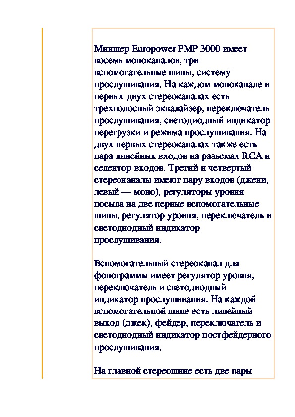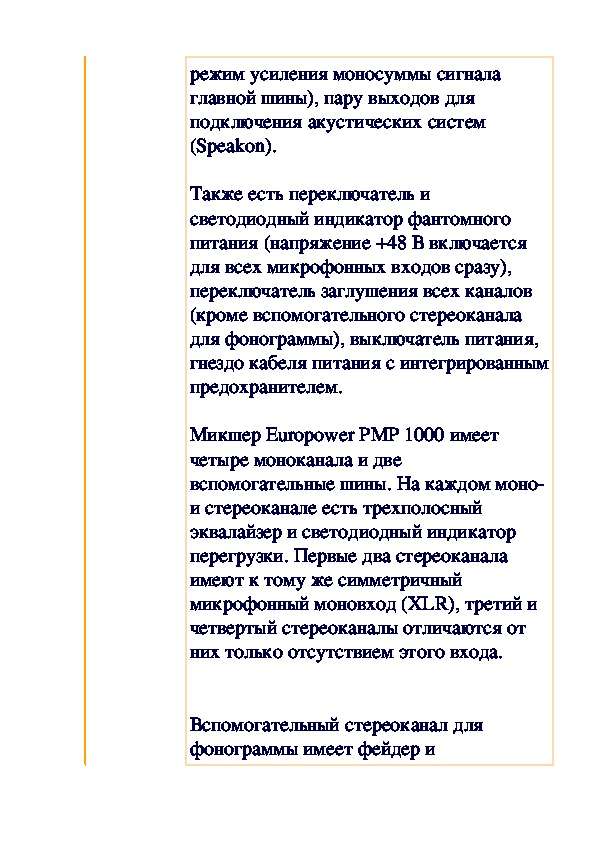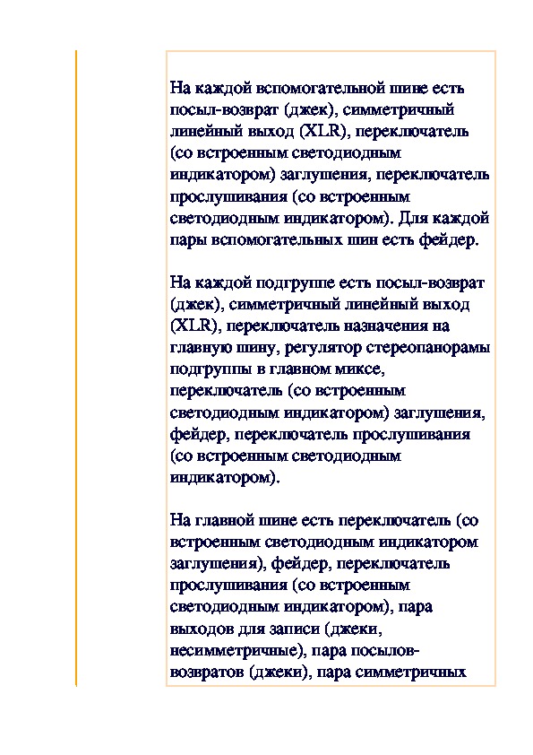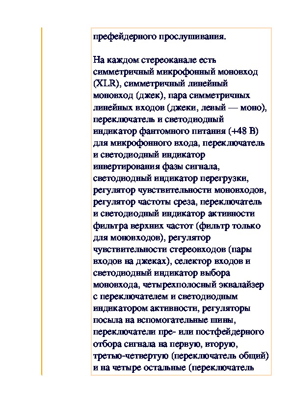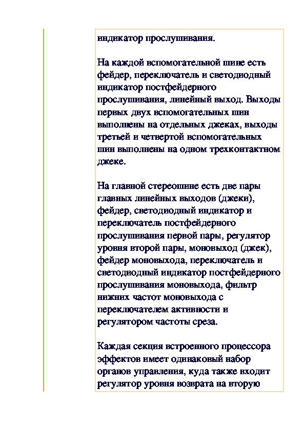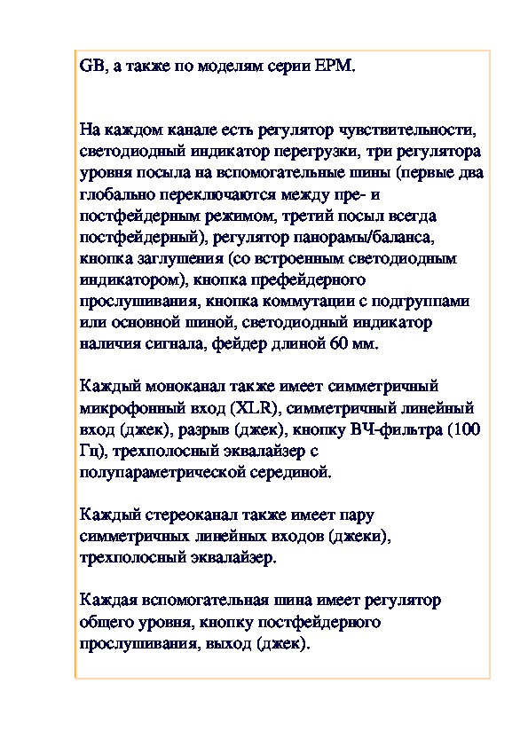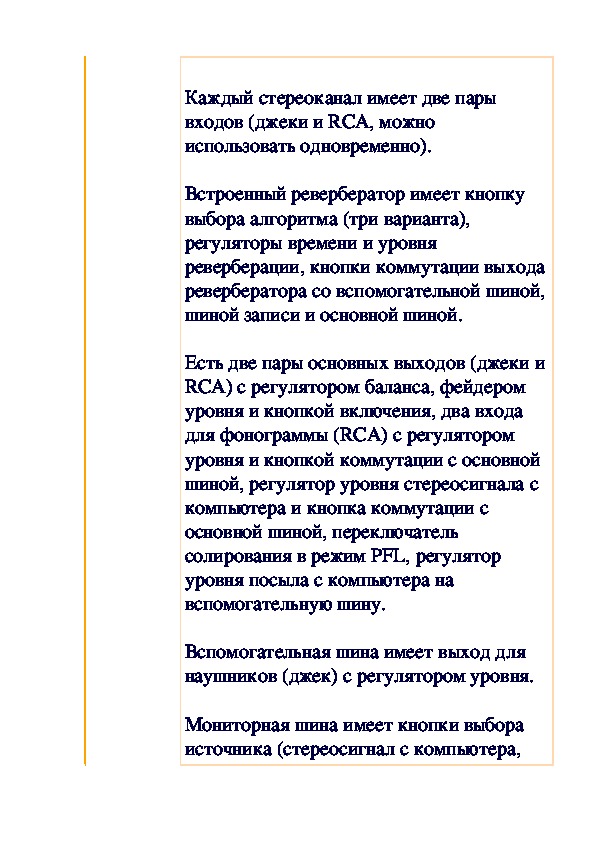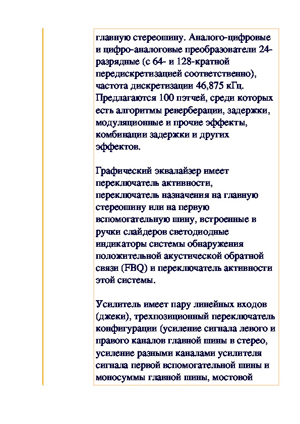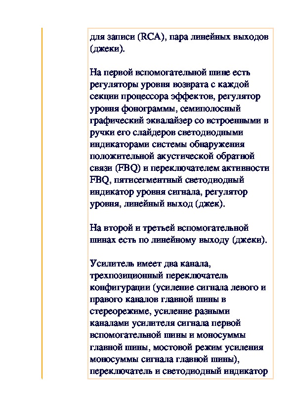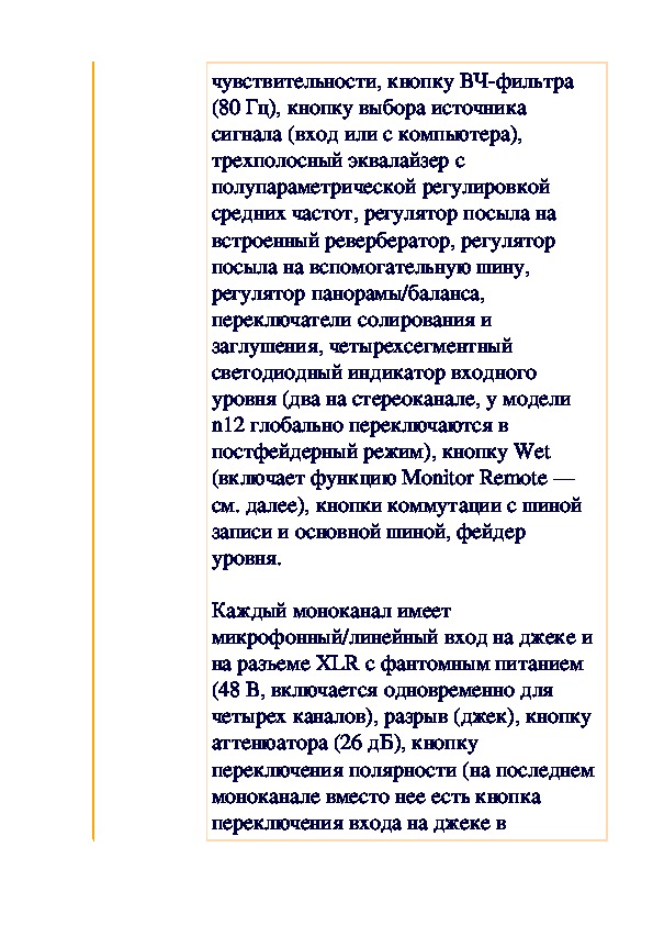 Микрофонный вход (комбинированный разъем XLR/джек на передней панели) имеет регуляторы уровня и трехполосного эквалайзера, кнопку назначения на обработку, трехпозиционный переключатель режима работы (выключен, включен, включен с функцией автоматического понижения уровня остальных каналов).