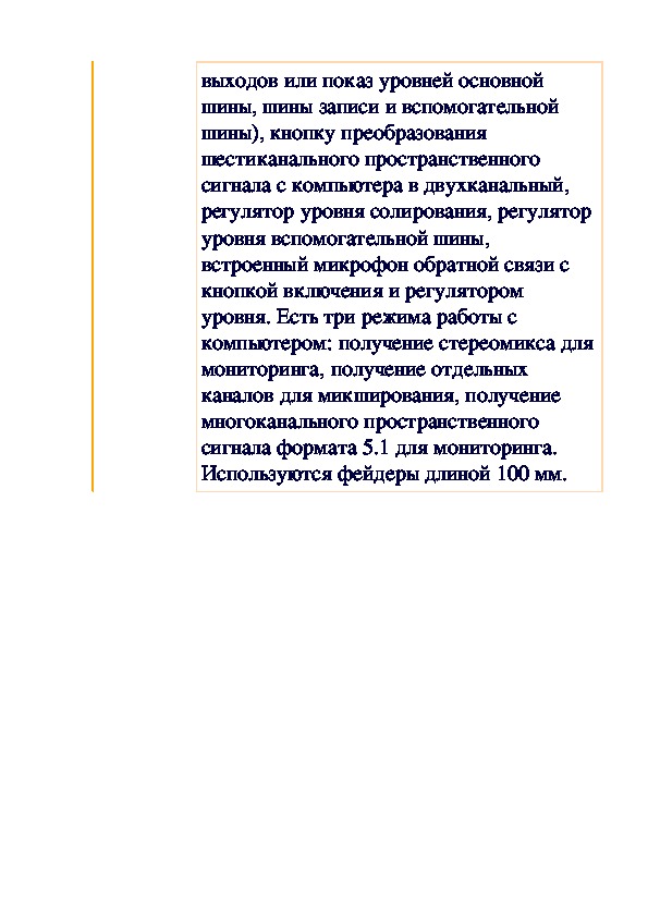 Есть кроссфейдер (сменный) с переключателем характеристики, кнопка включения режима раздельного мониторинга с регулятором баланса уровней (программный/мониторный), выключатель заземления.