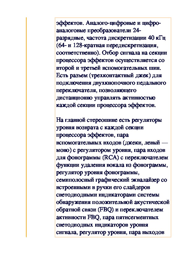 Процессор эффектов имеет селектор алгоритма (25 вариантов, в том числе дилеи, паннер, фейзер, фленджеры, фильтры, тремоло, вокодер и др.), регулятор параметра, регулятор баланса прямого и обработанного сигналов, пять кнопок для сохранения и вызова настроек, жидкокристаллический дисплей с подсветкой, кнопку включения. Возможна обработка одного из каналов или мастер-шины. Есть кнопка ввода темпа или включения автоматического счетчика, кнопка включения синхронизации параметров эффектов с темпом, селектор отношения между параметрами и темпом.