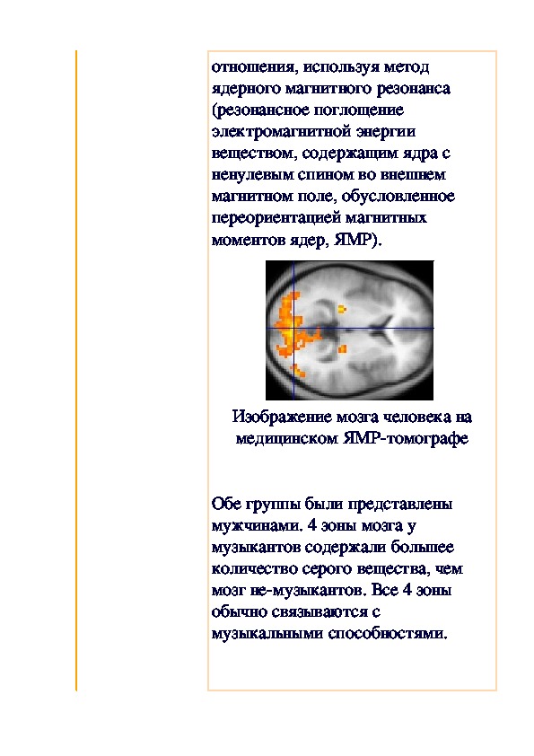 Так, например, было показано, что мозг музыкантов в определенных зонах имеет гораздо больше нервных клеток. Профессор Готтфред Шлауг обследовал профессиональных музыкантов и 15 человек, не имеющих к музыке никакого отношения, используя метод ядерного магнитного резонанса (резонансное поглощение электромагнитной энергии веществом, содержащим ядра с ненулевым спином во внешнем магнитном поле, обусловленное переориентацией магнитных моментов ядер, ЯМР).