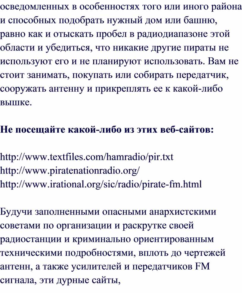 Будучи заполненными опасными анархистскими советами по организации и раскрутке своей радиостанции и криминально ориентированным техническими подробностями, вплоть до чертежей антенн, а также усилителей и передатчиков FM сигнала, эти дурные сайты, несомненно, многих повели по кривой дорожке.