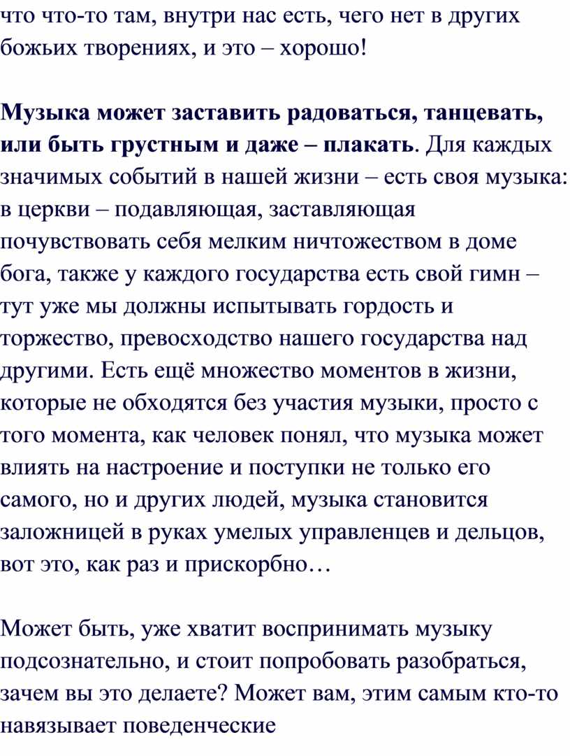 Музыка может заставить радоваться, танцевать, или быть грустным и даже – плакать. Для каждых значимых событий в нашей жизни – есть своя музыка: в церкви – подавляющая, заставляющая почувствовать себя мелким ничтожеством в доме бога, также у каждого государства есть свой гимн – тут уже мы должны испытывать гордость и торжество, превосходство нашего государства над другими. Есть ещё множество моментов в жизни, которые не обходятся без участия музыки, просто с того момента, как человек понял, что музыка может влиять на настроение и поступки не только его самого, но и других людей, музыка становится заложницей в руках умелых управленцев и дельцов, вот это, как раз и прискорбно…