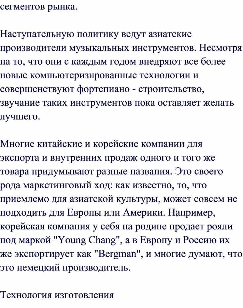 Наступательную политику ведут азиатские производители музыкальных инструментов. Несмотря на то, что они с каждым годом внедряют все более новые компьютеризированные технологии и совершенствуют фортепиано - строительство, звучание таких инструментов пока оставляет желать лучшего.