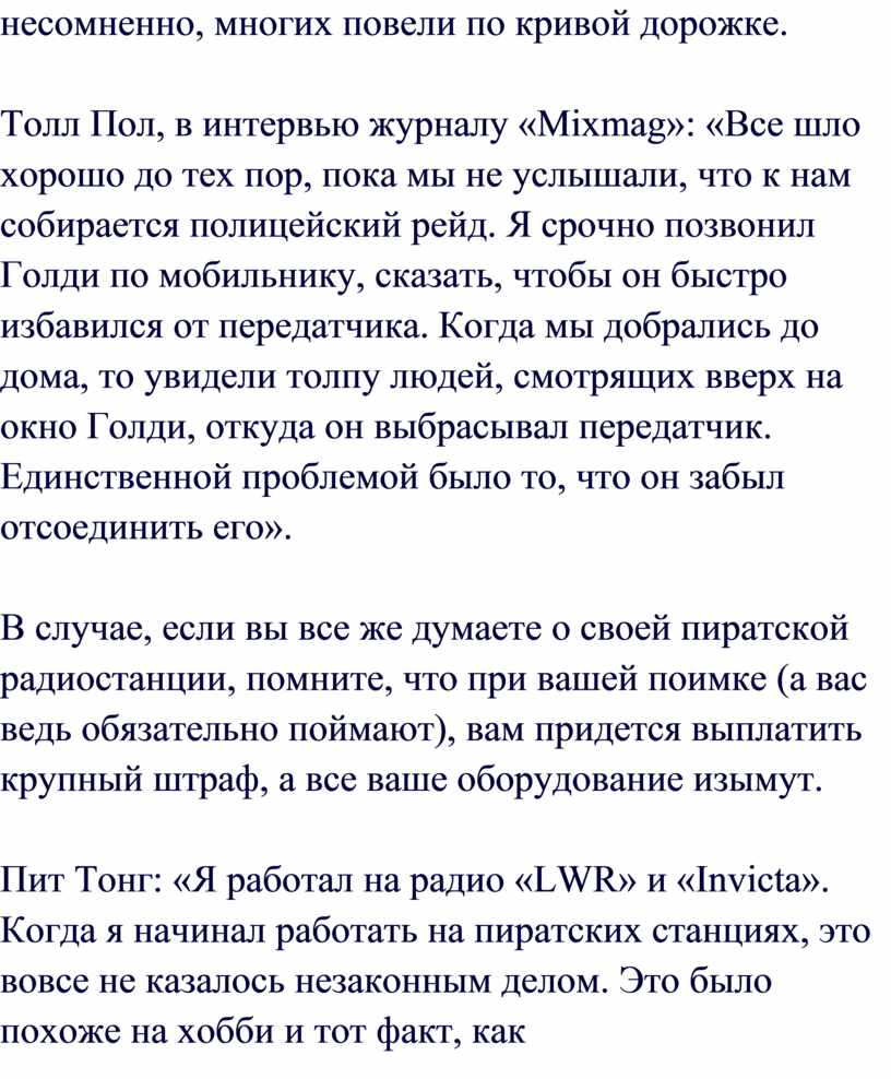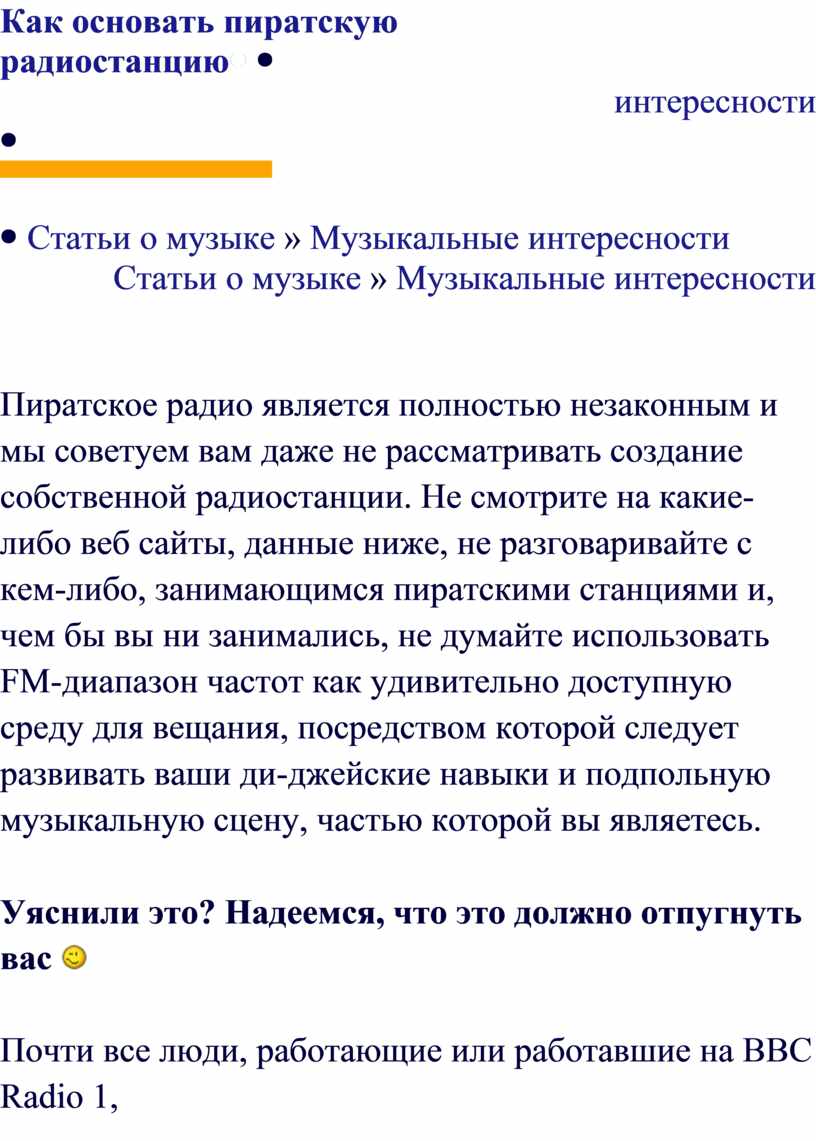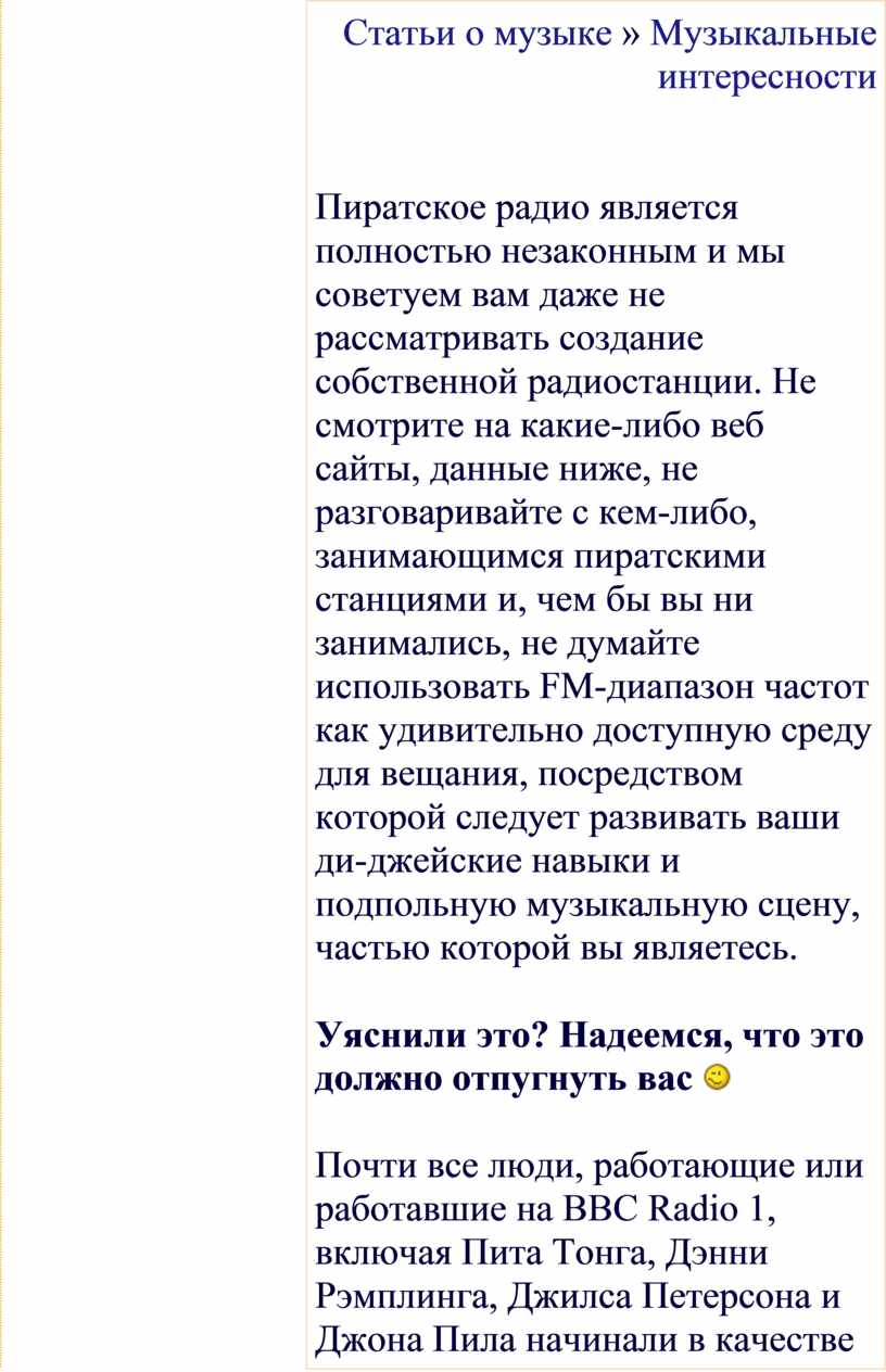 Пиратское радио является полностью незаконным и мы советуем вам даже не рассматривать создание собственной радиостанции. Не смотрите на какие-либо веб сайты, данные ниже, не разговаривайте с кем-либо, занимающимся пиратскими станциями и, чем бы вы ни занимались, не думайте использовать FM-диапазон частот как удивительно доступную среду для вещания, посредством которой следует развивать ваши ди-джейские навыки и подпольную музыкальную сцену, частью которой вы являетесь.