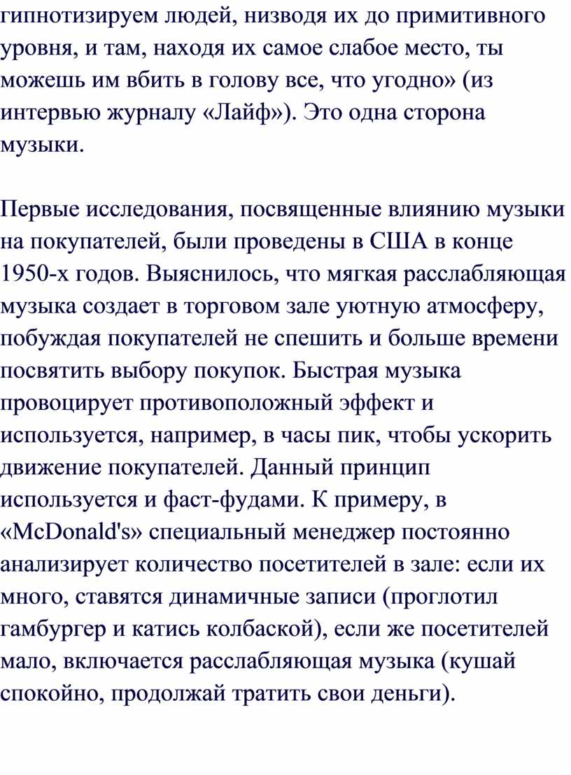 Первые исследования, посвященные влиянию музыки на покупателей, были проведены в США в конце 1950-х годов. Выяснилось, что мягкая расслабляющая музыка создает в торговом зале уютную атмосферу, побуждая покупателей не спешить и больше времени посвятить выбору покупок. Быстрая музыка провоцирует противоположный эффект и используется, например, в часы пик, чтобы ускорить движение покупателей. Данный принцип используется и фаст-фудами. К примеру, в «McDonald's» специальный менеджер постоянно анализирует количество посетителей в зале: если их много, ставятся динамичные записи (проглотил гамбургер и катись колбаской), если же посетителей мало, включается расслабляющая музыка (кушай спокойно, продолжай тратить свои деньги).