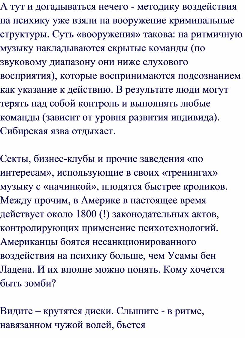 А тут и догадываться нечего - методику воздействия на психику уже взяли на вооружение криминальные структуры. Суть «вооружения» такова: на ритмичную музыку накладываются скрытые команды (по звуковому диапазону они ниже слухового восприятия), которые воспринимаются подсознанием как указание к действию. В результате люди могут терять над собой контроль и выполнять любые команды (зависит от уровня развития индивида). Сибирская язва отдыхает.