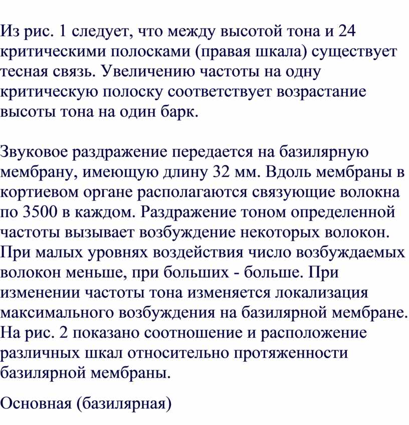Звуковое раздражение передается на базилярную мембрану, имеющую длину 32 мм. Вдоль мембраны в кортиевом органе располагаются связующие волокна по 3500 в каждом. Раздражение тоном определенной частоты вызывает возбуждение некоторых волокон. При малых уровнях воздействия число возбуждаемых волокон меньше, при больших - больше. При изменении частоты тона изменяется локализация максимального возбуждения на базилярной мембране. На рис. 2 показано соотношение и расположение различных шкал относительно протяженности базилярной мембраны.