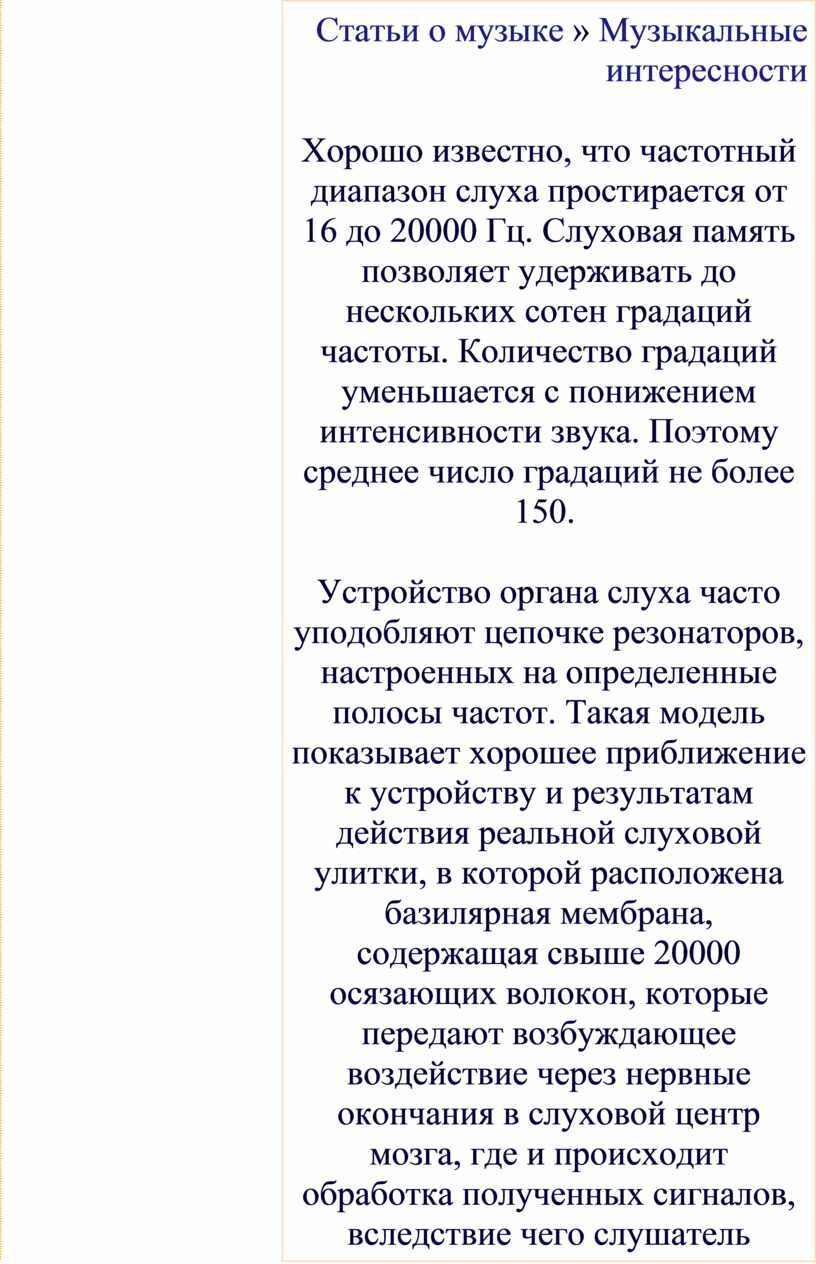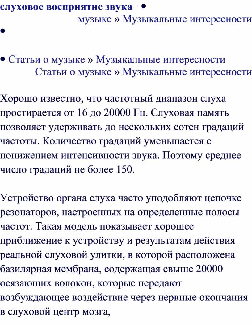 Хорошо известно, что частотный диапазон слуха простирается от 16 до 20000 Гц. Слуховая память позволяет удерживать до нескольких сотен градаций частоты. Количество градаций уменьшается с понижением интенсивности звука. Поэтому среднее число градаций не более 150.