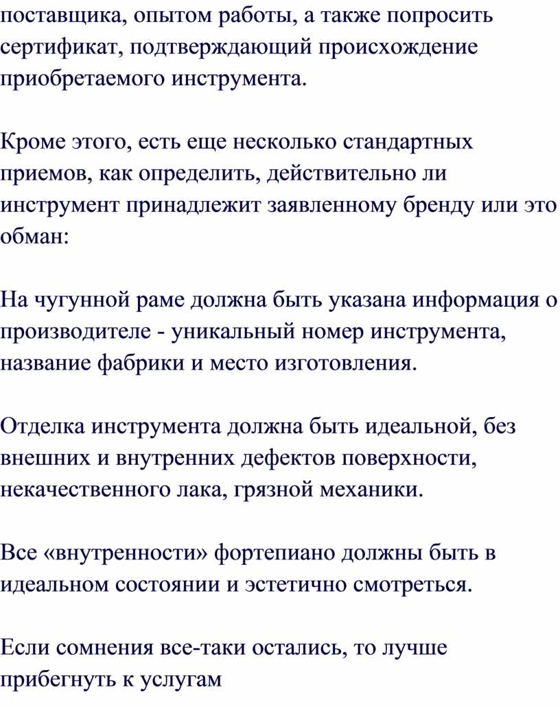 Рояли и пианино - совсем недешевые музыкальные инструменты, но при этом их можно смело отнести к товарам, которые будут пользоваться спросом всегда, пока живет и развивается культурная прослойка населения на земном шаре и, в частности, в России. Как и на любом другом рынке, на рынке музыкальных инструментов тоже работают недобросовестные продавцы, которые часто фальсифицируют страну-производителя или название торговой марки фортепиано для того, чтобы заработать дополнительную прибыль. На их уловки иногда попадаются даже профессиональные исполнители и преподаватели музыкальных учебных заведений.