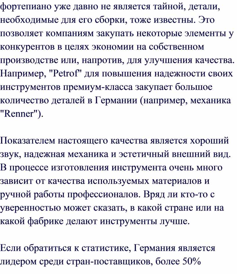 Технология изготовления фортепиано уже давно не является тайной, детали, необходимые для его сборки, тоже известны. Это позволяет компаниям закупать некоторые элементы у конкурентов в целях экономии на собственном производстве или, напротив, для улучшения качества. Например, "Petrof" для повышения надежности своих инструментов премиум-класса закупает большое количество деталей в Германии (например, механика "Renner").