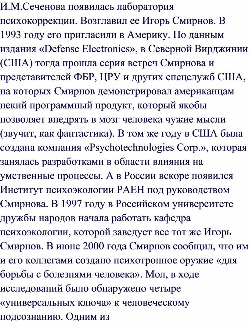 2 февраля 1980 года в 1-м Московском медицинском институте им. И.М.Сеченова появилась лаборатория психокоррекции. Возглавил ее Игорь Смирнов. В 1993 году его пригласили в Америку. По данным издания «Defense Electronics», в Северной Вирджинии (США) тогда прошла серия встреч Смирнова и представителей ФБР, ЦРУ и других спецслужб США, на которых Смирнов демонстрировал американцам некий программный продукт, который якобы позволяет внедрять в мозг человека чужие мысли (звучит, как фантастика). В том же году в США была создана компания «Psychotechnologies Corp.», которая занялась разработками в области влияния на умственные процессы. А в России вскоре появился Институт психоэкологии РАЕН под руководством Смирнова. В 1997 году в Российском университете дружбы народов начала работать кафедра психоэкологии, которой заведует все тот же Игорь Смирнов. В июне 2000 года Смирнов сообщил, что им и его коллегами создано психотронное оружие «для борьбы с болезнями человека». Мол, в ходе исследований было обнаружено четыре «универсальных ключа» к человеческому подсознанию. Одним из этих ключей стала психомузыка - вроде бы обыкновенная, в основном классическая, в которой содержится специальный неосознаваемый звуковой сигнал.