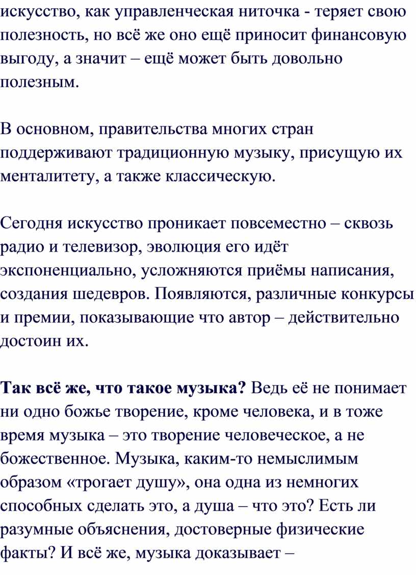 Так всё же, что такое музыка? Ведь её не понимает ни одно божье творение, кроме человека, и в тоже время музыка – это творение человеческое, а не божественное. Музыка, каким-то немыслимым образом «трогает душу», она одна из немногих способных сделать это, а душа – что это? Есть ли разумные объяснения, достоверные физические факты? И всё же, музыка доказывает – что что-то там, внутри нас есть, чего нет в других божьих творениях, и это – хорошо!