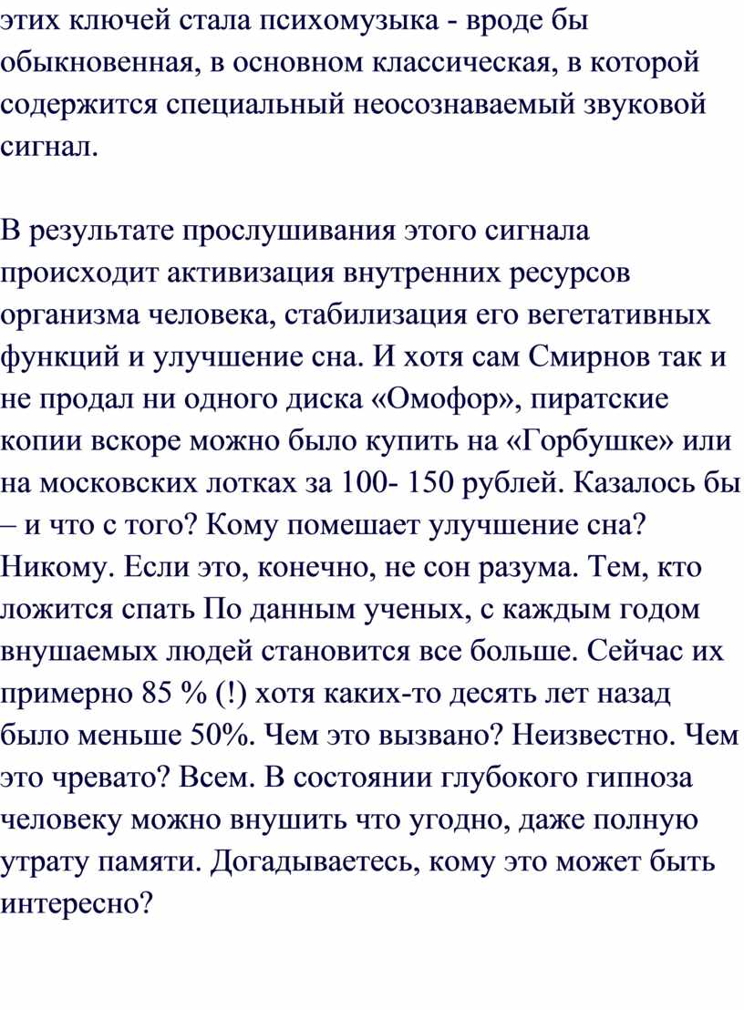 В результате прослушивания этого сигнала происходит активизация внутренних ресурсов организма человека, стабилизация его вегетативных функций и улучшение сна. И хотя сам Смирнов так и не продал ни одного диска «Омофор», пиратские копии вскоре можно было купить на «Горбушке» или на московских лотках за 100- 150 рублей. Казалось бы – и что с того? Кому помешает улучшение сна? Никому. Если это, конечно, не сон разума. Тем, кто ложится спать По данным ученых, с каждым годом внушаемых людей становится все больше. Сейчас их примерно 85 % (!) хотя каких-то десять лет назад было меньше 50%. Чем это вызвано? Неизвестно. Чем это чревато? Всем. В состоянии глубокого гипноза человеку можно внушить что угодно, даже полную утрату памяти. Догадываетесь, кому это может быть интересно?