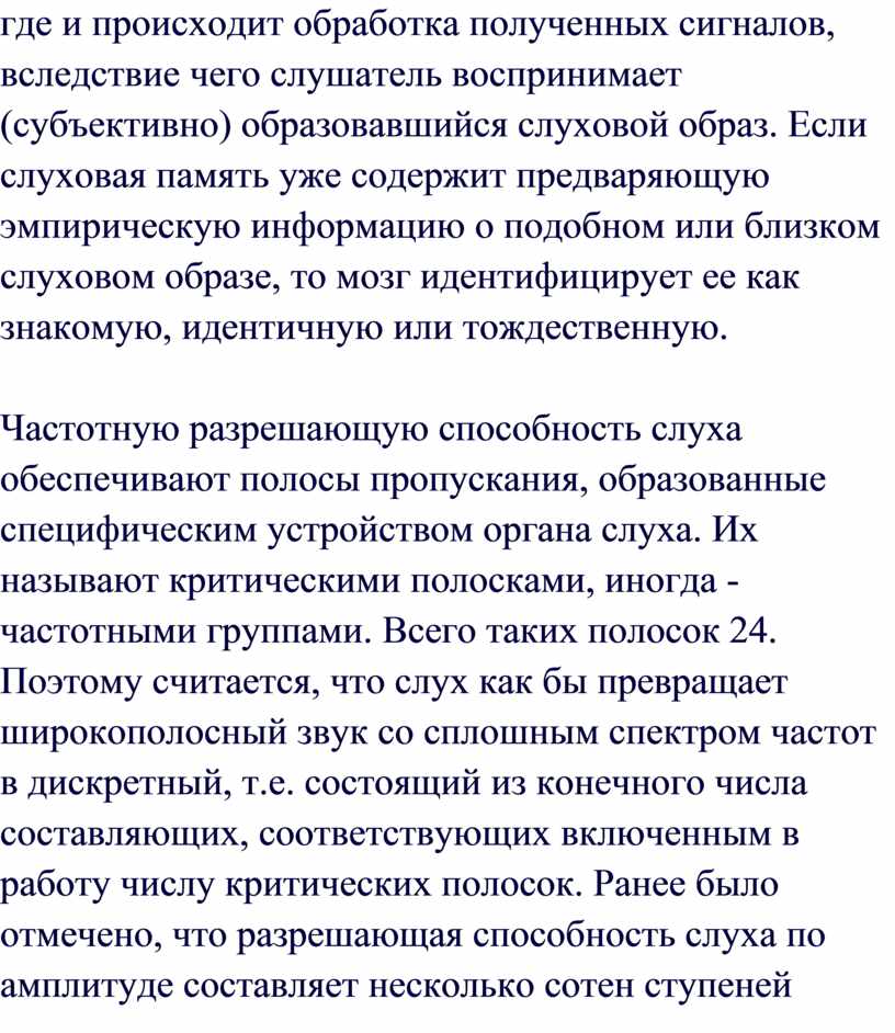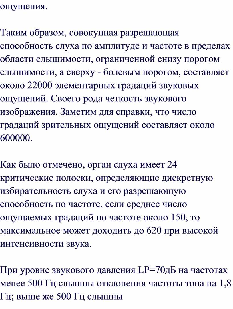 Как было отмечено, орган слуха имеет 24 критические полоски, определяющие дискретную избирательность слуха и его разрешающую способность по частоте. если среднее число ощущаемых градаций по частоте около 150, то максимальное может доходить до 620 при высокой интенсивности звука.