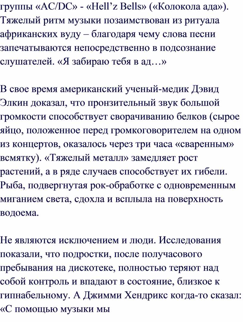 Никогда в истории человечества не звучало столько музыки, как сейчас. Но на самом деле она не просто звучит – она исполняет свою функцию программирования. И это отнюдь не пустые слова параноика. Их могут подтвердить беспристрастные факты... Все это рок-н-ролл «Я шаровая молния. Я проливаю дождь... Ты еще молод, но ты умрешь. Я не буду брать заложников и не поделюсь ни одной жизнью... Меня зовет колокол. Я забираю тебя в ад...» Это слова из одной из самых популярных песен рок-группы «AC/DC» - «Hell’z Bells» («Колокола ада»). Тяжелый ритм музыки позаимствован из ритуала африканских вуду – благодаря чему слова песни запечатываются непосредственно в подсознание слушателей. «Я забираю тебя в ад…»