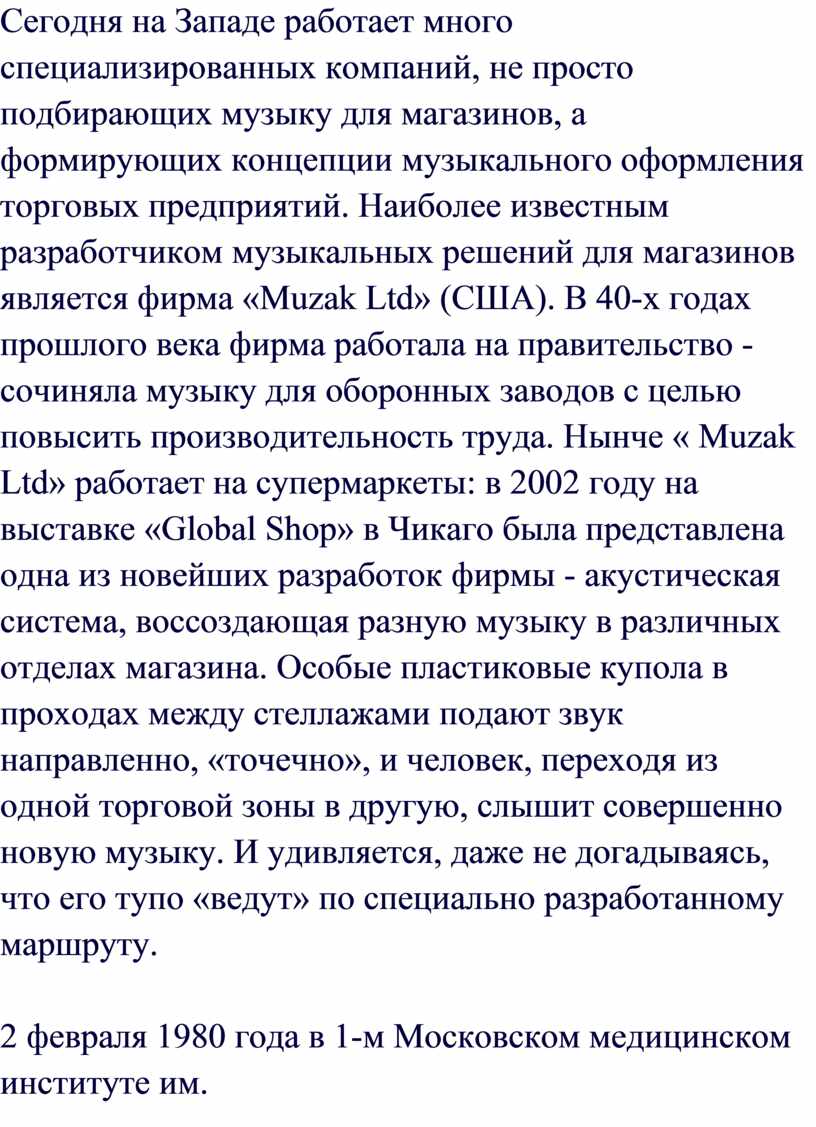 Сегодня на Западе работает много специализированных компаний, не просто подбирающих музыку для магазинов, а формирующих концепции музыкального оформления торговых предприятий. Наиболее известным разработчиком музыкальных решений для магазинов является фирма «Muzak Ltd» (США). В 40-х годах прошлого века фирма работала на правительство - сочиняла музыку для оборонных заводов с целью повысить производительность труда. Нынче « Muzak Ltd» работает на супермаркеты: в 2002 году на выставке «Global Shop» в Чикаго была представлена одна из новейших разработок фирмы - акустическая система, воссоздающая разную музыку в различных отделах магазина. Особые пластиковые купола в проходах между стеллажами подают звук направленно, «точечно», и человек, переходя из одной торговой зоны в другую, слышит совершенно новую музыку. И удивляется, даже не догадываясь, что его тупо «ведут» по специально разработанному маршруту.