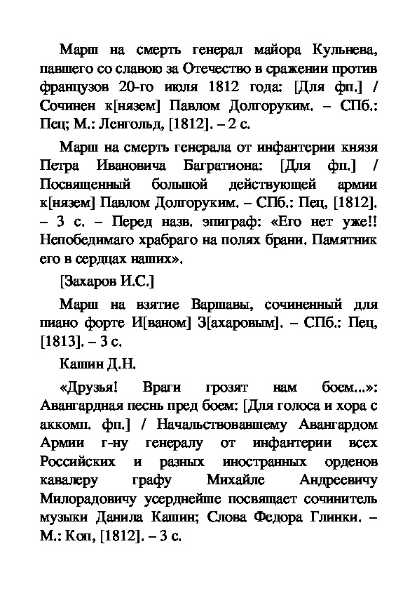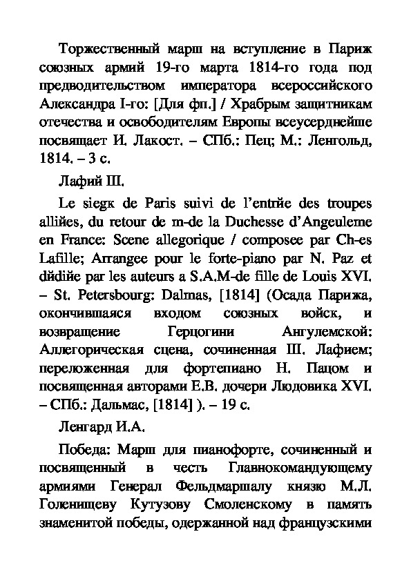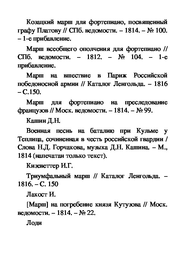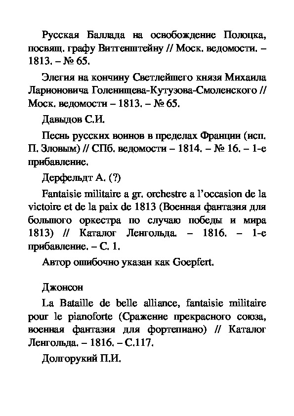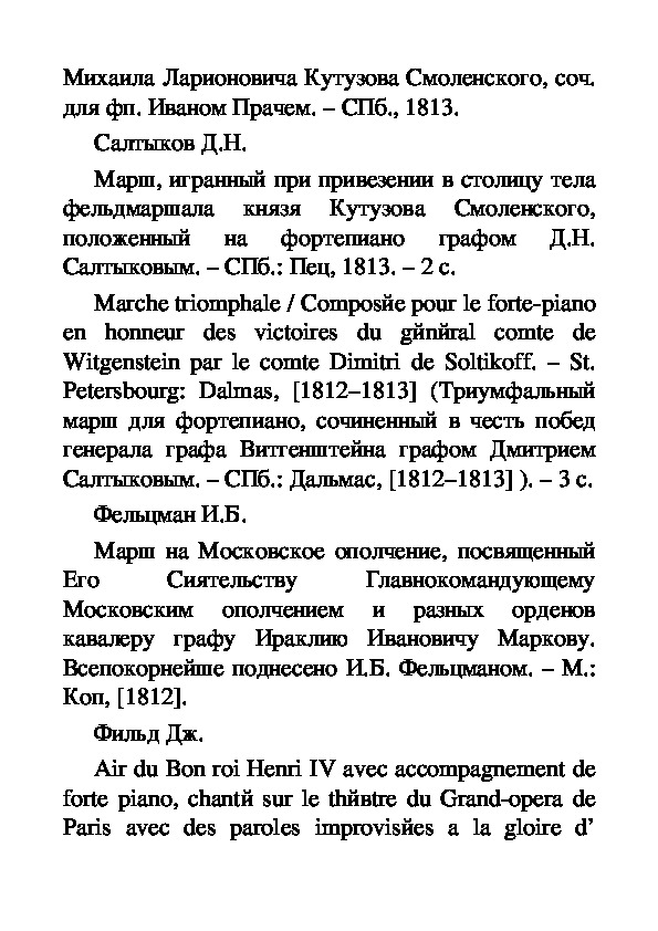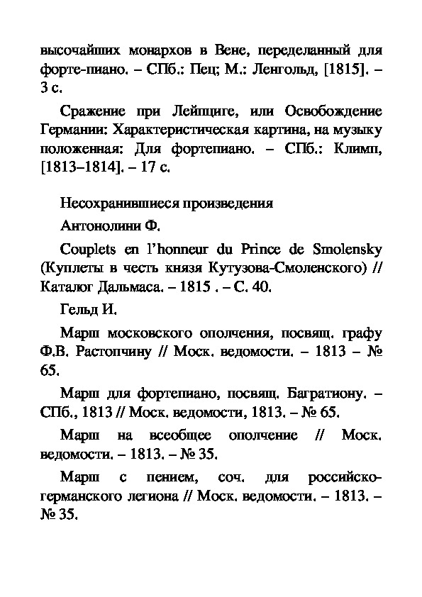 Однако музыке повезло меньше других видов искусств. Далеко не все произведения дошли до нашего времени, а сохранившиеся нотные издания стали библиографической редкостью, существуя лишь в единичных экземплярах. Они хранятся в разных библиотеках Москвы и Петербурга, и знают о них только специалисты. И хотя некоторые из этих изданий все же были описаны в работах Н.Ф. Финдейзена, В.И. Музалевского и других музыковедов, полного каталога музыки, созданной в период Отечественной войны, до сих пор не существует. Поэтому перед исследователями русской музыкальной культуры 1-й четверти XIX века стоит нелегкая задача – выяснить, что же именно из произведений того времени сохранилось, какие произведения составляют музыкальную летопись Отечественной войны.
