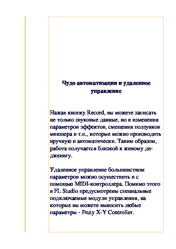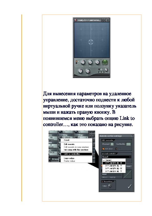 Удаленное управление большинством параметров можно осуществить и с помощью MIDI-контроллера. Помимо этого в FL Studio предусмотрены специальные подключаемые модули управления, на которые вы можете выносить любые параметры - Fruty X-Y Controller.