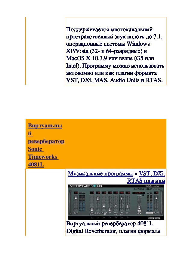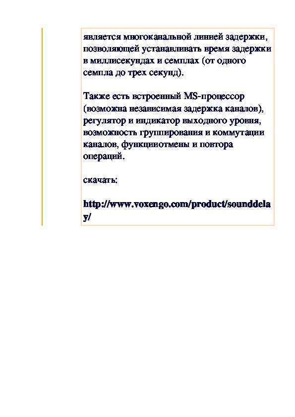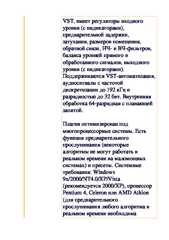 · Внутренняя обработка - 32 бита с плавающей точкой, до 96 КГц стерео.