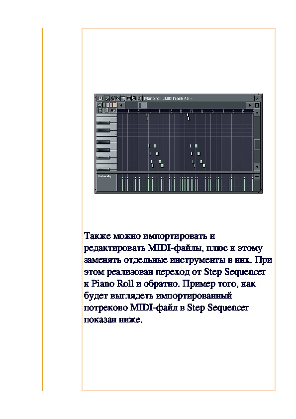 Также можно импортировать и редактировать MIDI-файлы, плюс к этому заменять отдельные инструменты в них. При этом реализован переход от Step Sequencer к Piano Roll и обратно. Пример того, как будет выглядеть импортированный потреково MIDI-файл в Step Sequencer показан ниже.