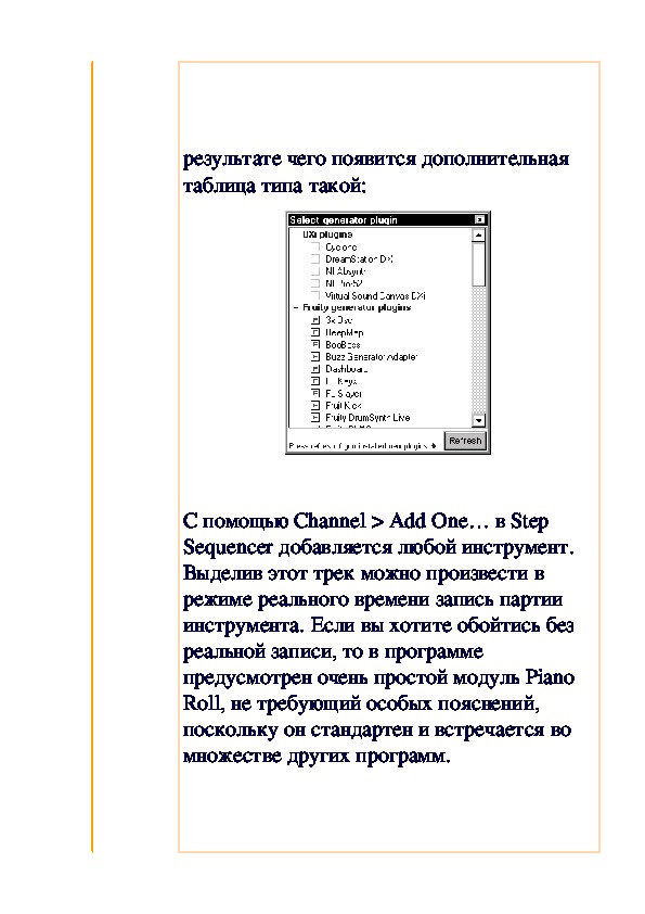С помощью Channel > Add One… в Step Sequencer добавляется любой инструмент. Выделив этот трек можно произвести в режиме реального времени запись партии инструмента. Если вы хотите обойтись без реальной записи, то в программе предусмотрен очень простой модуль Piano Roll, не требующий особых пояснений, поскольку он стандартен и встречается во множестве других программ.