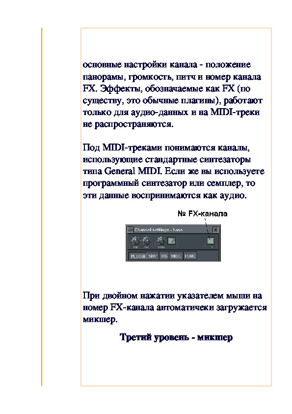 В зависимости о того, что вы загрузили в качестве канала, так у вас будет выглядеть и окно свойств. В этих окнах производятся основные настройки канала - положение панорамы, громкость, питч и номер канала FX. Эффекты, обозначаемые как FX (по существу, это обычные плагины), работают только для аудио-данных и на MIDI-треки не распространяются.