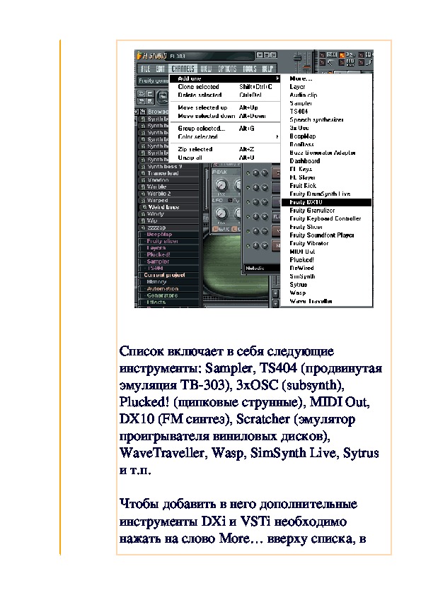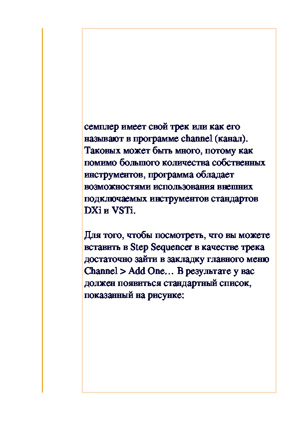 Любой инструмент, будь то синтезатор или семплер имеет свой трек или как его называют в программе channel (канал). Таковых может быть много, потому как помимо большого количества собственных инструментов, программа обладает возможностями использования внешних подключаемых инструментов стандартов DXi и VSTi.