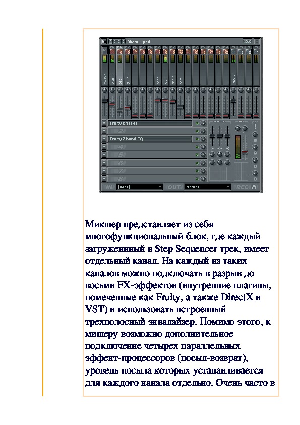 Микшер представляет из себя многофункциональный блок, где каждый загруженнный в Step Sequencer трек, имеет отдельный канал. На каждый из таких каналов можно подключать в разрыв до восьми FX-эффектов (внутренние плагины, помеченные как Fruity, а также DirectX и VST) и использовать встроенный трехполосный эквалайзер. Помимо этого, к мишеру возможно дополнительное подключение четырех параллельных эффект-процессоров (посыл-возврат), уровень посыла которых устанавливается для каждого канала отдельно. Очень часто в качестве таких эффект-процессоров поключают хорус, дилэй и реверберацию. Для мастер-трека, также можно подключить восемь FX'ов, в качестве которых часто используются процессоры финальной обработки - энхансеры, компрессоры, эквалайзеры, ревербераторы и т.п.