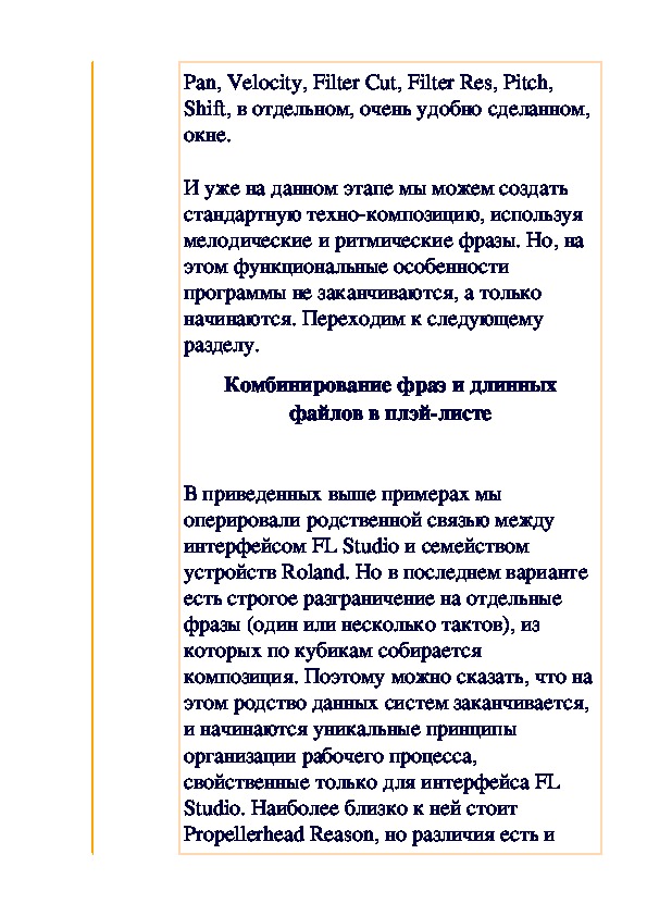 В приведенных выше примерах мы оперировали родственной связью между интерфейсом FL Studio и семейством устройств Roland. Но в последнем варианте есть строгое разграничение на отдельные фразы (один или несколько тактов), из которых по кубикам собирается композиция. Поэтому можно сказать, что на этом родство данных систем заканчивается, и начинаются уникальные принципы организации рабочего процесса, свойственные только для интерфейса FL Studio. Наиболее близко к ней стоит Propellerhead Reason, но различия есть и здесь.