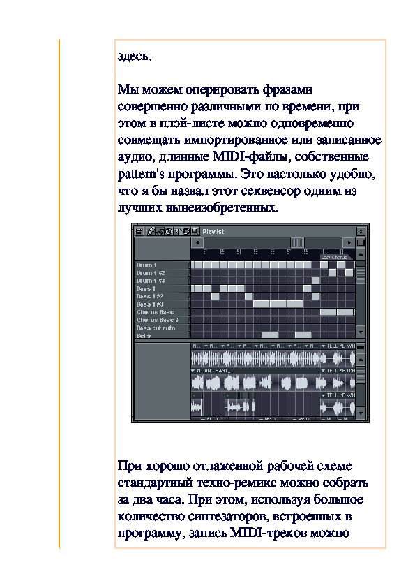 Мы можем оперировать фразами совершенно различными по времени, при этом в плэй-листе можно одновременно совмещать импортированное или записанное аудио, длинные MIDI-файлы, собственные pattern's программы. Это настолько удобно, что я бы назвал этот секвенсор одним из лучших нынеизобретенных.