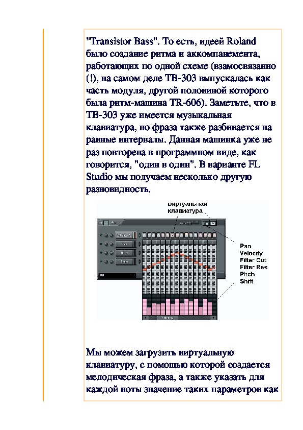 Аббревиатура "TB" расшифровывается как "Transistor Bass". То есть, идеей Roland было создание ритма и аккомпанемента, работающих по одной схеме (взамосвязанно (!), на самом деле TB-303 выпускалась как часть модуля, другой половиной которого была ритм-машина TR-606). Заметьте, что в TB-303 уже имеется музыкальная клавиатура, но фраза также разбивается на равные интервалы. Данная машинка уже не раз повторена в программном виде, как говорится, "один в один". В варианте FL Studio мы получаем несколько другую разновидность.