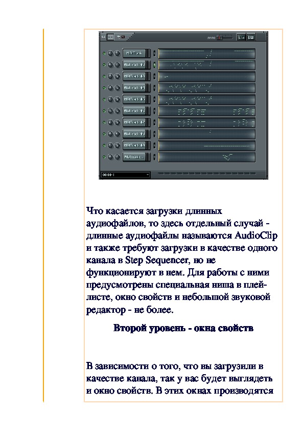 Что касается загрузки длинных аудиофайлов, то здесь отдельный случай - длинные аудиофайлы называются AudioClip и также требуют загрузки в качестве одного канала в Step Sequencer, но не функционируют в нем. Для работы с ними предусмотрены специальная ниша в плей-листе, окно свойств и небольшой звуковой редактор - не более.