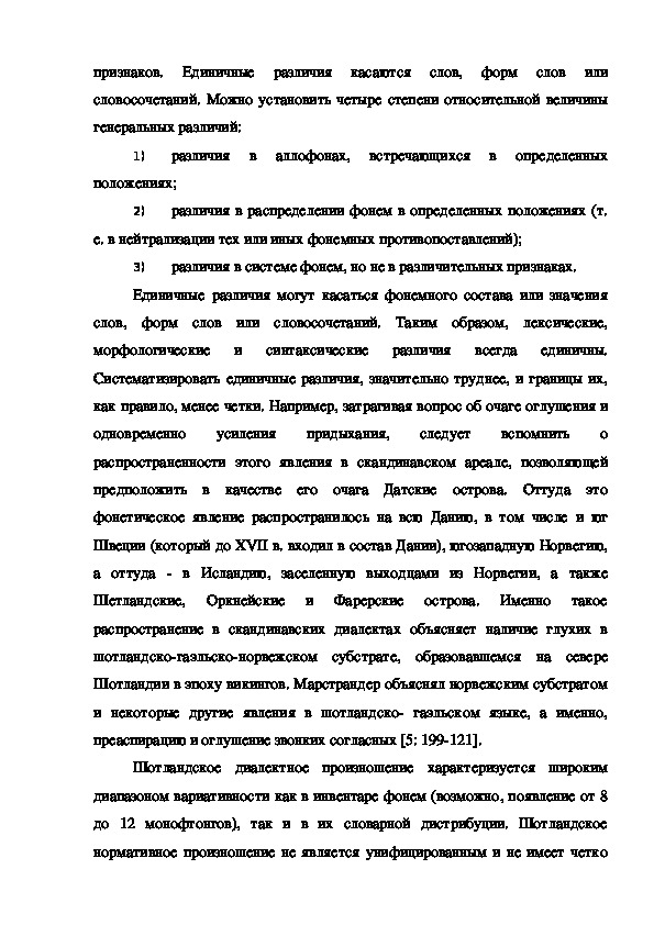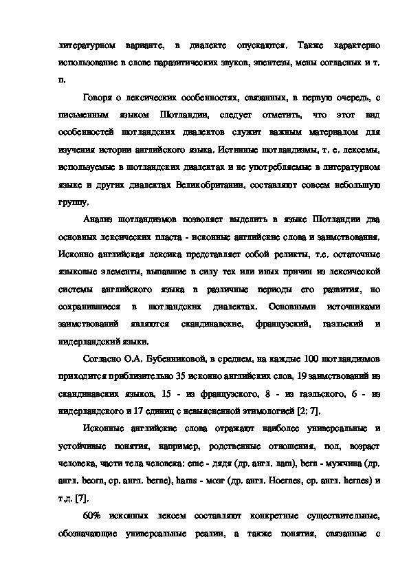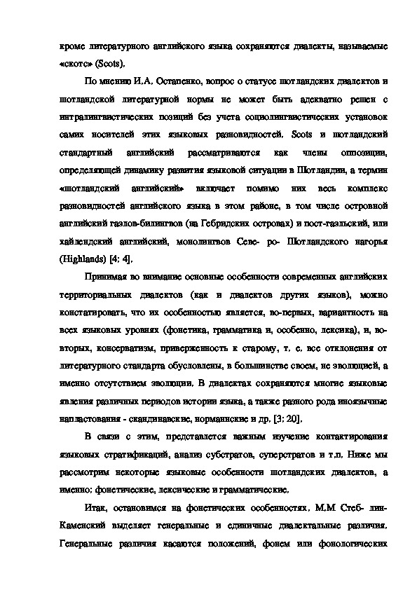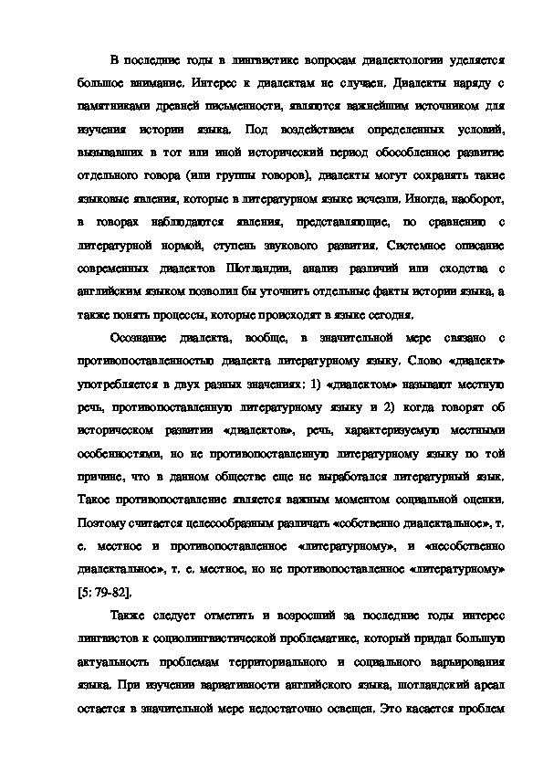 В последние годы в лингвистике вопросам диалектологии уделяется большое внимание. Интерес к диалектам не случаен. Диалекты наряду с памятниками древней письменности, являются важнейшим источником для изучения истории языка. Под воздействием определенных условий, вызывавших в тот или иной исторический период обособленное развитие отдельного говора (или группы говоров), диалекты могут сохранять такие языковые явления, которые в литературном языке исчезли. Иногда, наоборот, в говорах наблюдаются явления, представляющие, по сравнению с литературной нормой, ступень звукового развития. Системное описание современных диалектов Шотландии, анализ различий или сходства с английским языком позволил бы уточнить отдельные факты истории языка, а также понять процессы, которые происходят в языке сегодня.статья