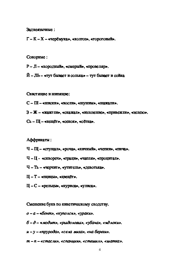 гласные (у,о); сонорные; свистящие и шипящие, аффрикаты смешиваются как