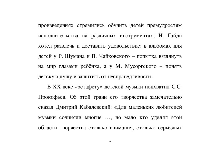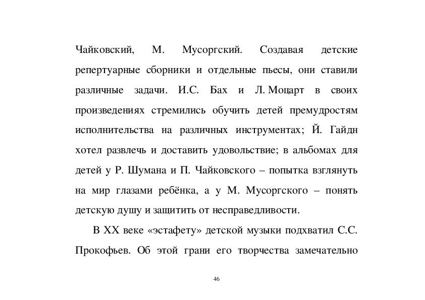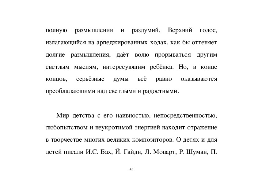 Мир детства с его наивностью, непосредственностью, любопытством и неукротимой энергией находит отражение в творчестве многих великих композиторов. О детях и для детей писали И.С. Бах, Й. Гайдн, Л. Моцарт, Р. Шуман, П. Чайковский, М. Мусоргский. Создавая детские репертуарные сборники и отдельные пьесы, они ставили различные задачи. И.С. Бах и Л. Моцарт в своих произведениях стремились обучить детей премудростям исполнительства на различных инструментах; Й. Гайдн хотел развлечь и доставить удовольствие; в альбомах для детей у Р. Шумана и П. Чайковского – попытка взглянуть на мир глазами ребёнка, а у М. Мусоргского – понять детскую душу и защитить от несправедливости.